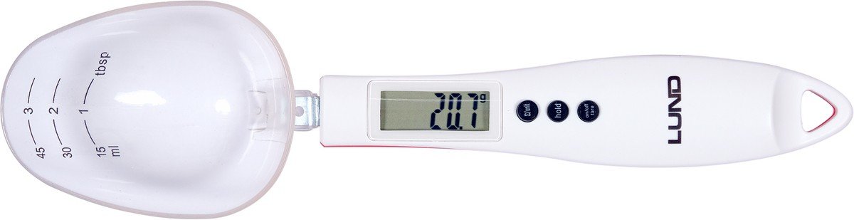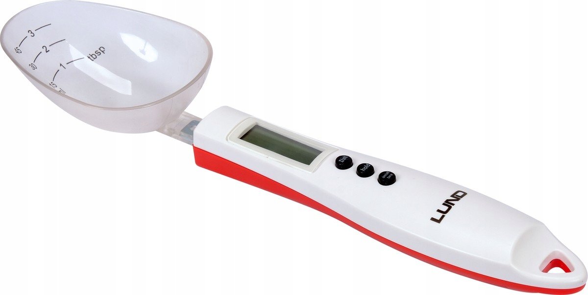 Waga kuchenna LUND z łyżką o całkowitej pojemności 75ml i maksymalnym obciążeniu 300g. Wyposażona w czytelny wyświetlacz LCD pokazujący 2 jednostki wagi do wyboru oraz wskaźniki przeciążenia i niskiego poziomu baterii. Urządzenie posiada aż 4 przydatne funkcje – pomiaru, utrzymywaniu cyfry na wyświetlaczu, sumowania i tary.