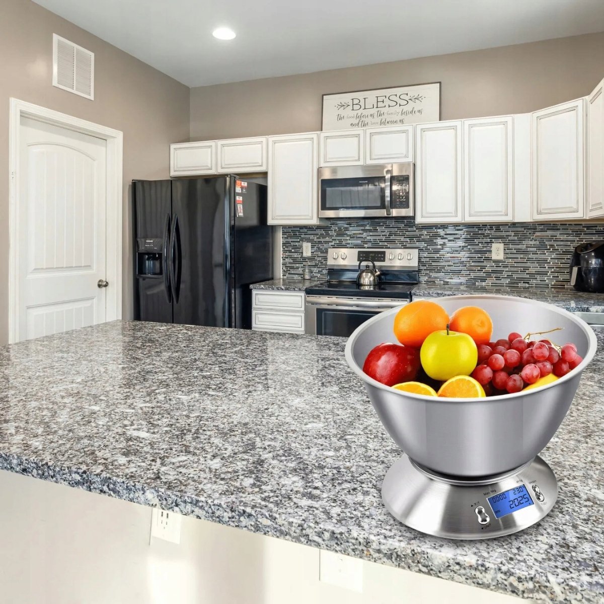 Elektroniczna waga kuchenna to nowoczesne i precyzyjne urządzenie niezbędne w każdej kuchni. Dzięki dokładności do 1 grama i maksymalnemu udźwigowi 5 kg sprawdzi się zarówno przy odmierzaniu niewielkich ilości składników, jak i większych porcji. W zestawie znajduje się stalowa misa o pojemności 1,8 litra, a urządzenie wyposażono w funkcję tary, timer, termometr i wyświetlacz LCD. Waga umożliwia wybór różnych jednostek miary, a jej elegancki, nierdzewny design gwarantuje trwałość oraz łatwe czyszczenie.