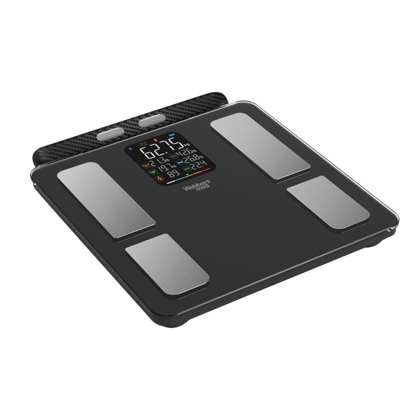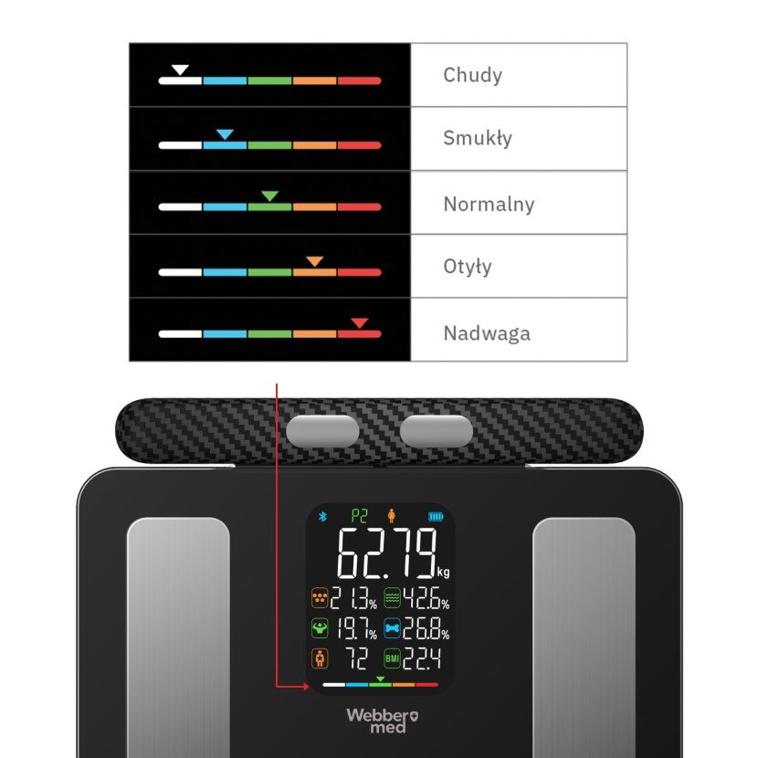 - Wyświetlacz: Kolorowy LCD, wyświetlanie 8 pomiarów na ekranie wagi, Dostęp do wszystkich 15 danych z poziomu aplikacji