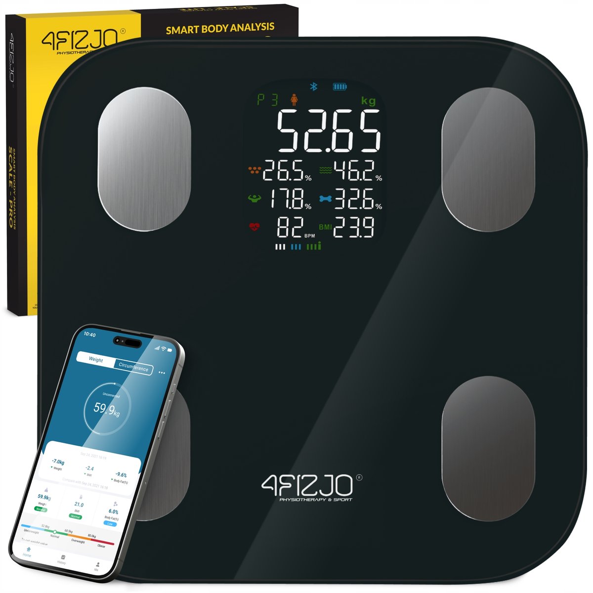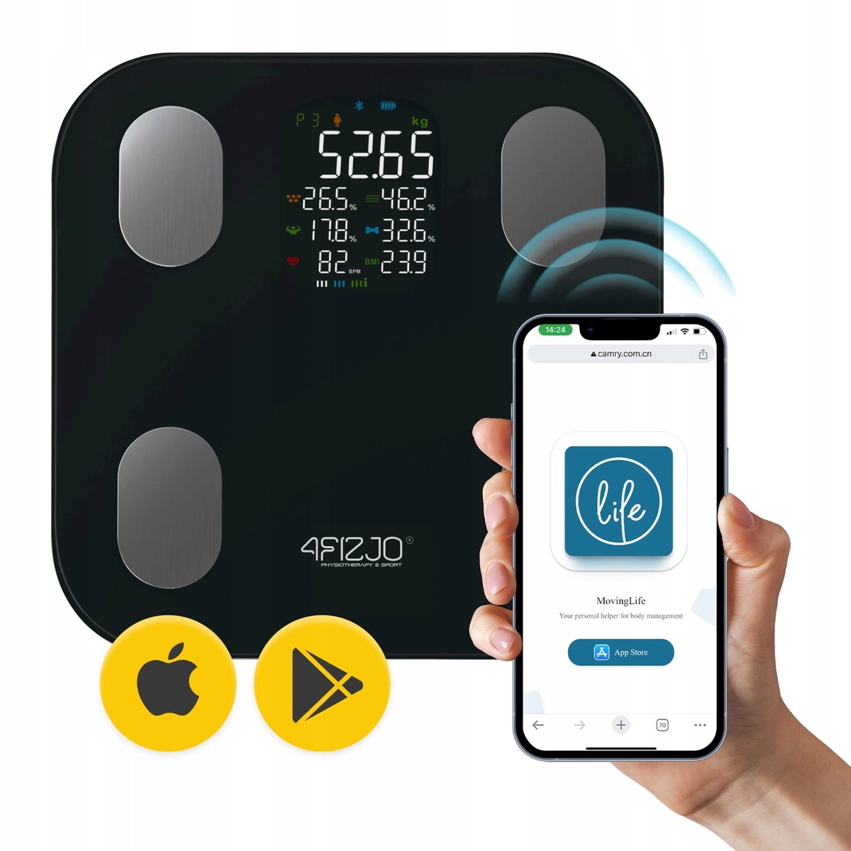 Waga łazienkowa elektroniczna 4FIZJO wyróżnia się nowoczesną technologią i precyzyjnością pomiaru dzięki wbudowanym 4 elektrodom. Za sprawą czujników możliwe jest określenie kilkunastu różnych informacji o twoim ciele. Inteligentna waga jest kompatybilna z aplikacją MovingLife. Jest ona dostępna na iOS 8.0 i nowsze oraz Androidy 4.3 i nowsze. Połączenie aplikacji z urządzeniem umożliwia łączność Bluetooth 4.0 lub nowsze oraz moduł Wi-Fi. Te praktyczne rozwiązania pozwalają przetworzyć dane, prezentując dokładny odczyt sylwetki i analizy składu ciała.