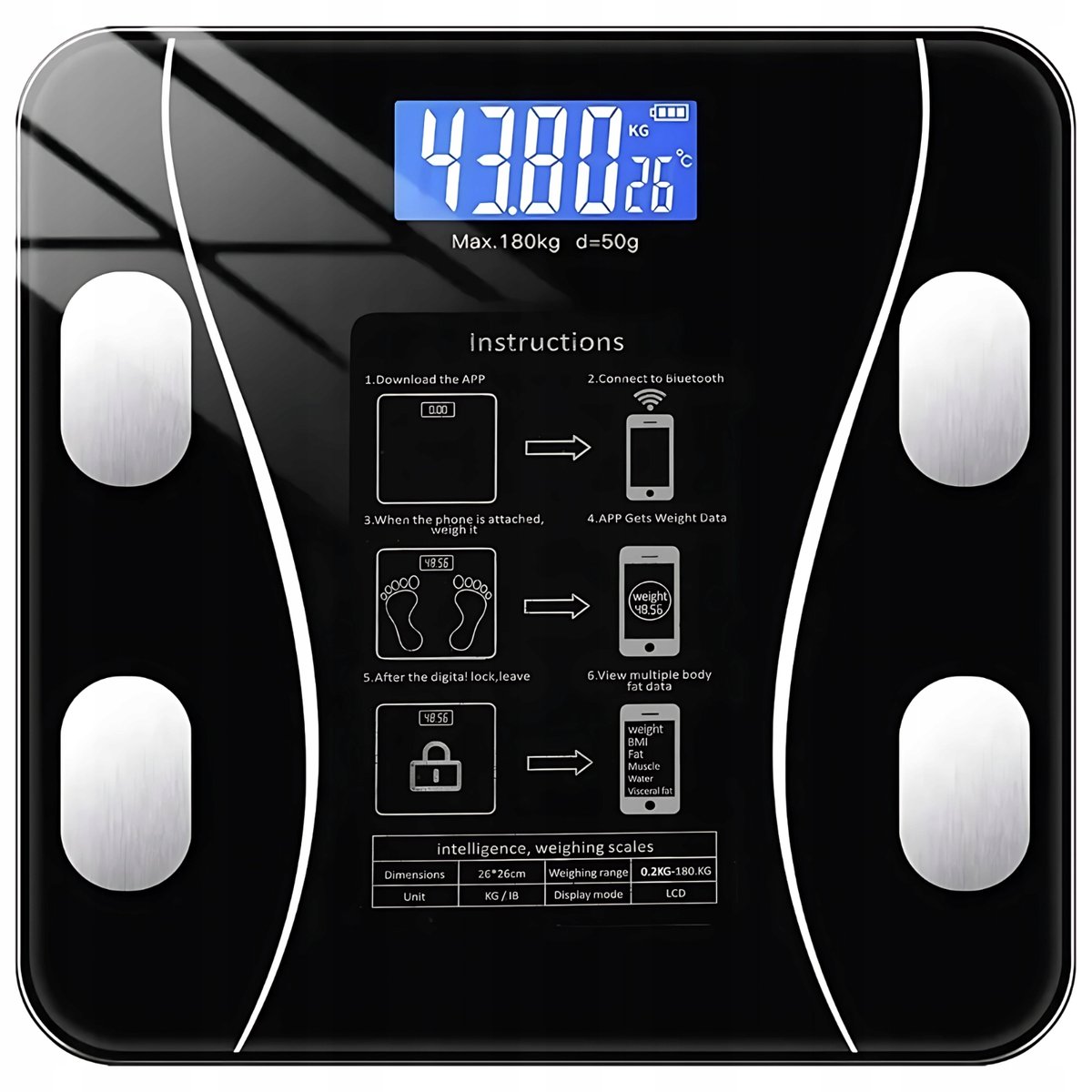Inowacyjna waga jest idealna dla osób, które chcą dokładnie monitorować swoją wagę, skład ciała oraz poziom nawodnienia organizmu oraz wiele innych parametrów naszego ciała. Waga łazienkowa to urządzenie SMART z połączeniem Bluetooth ponad 25 funkcjami i bardzo precyzyjnymi pomiarami.