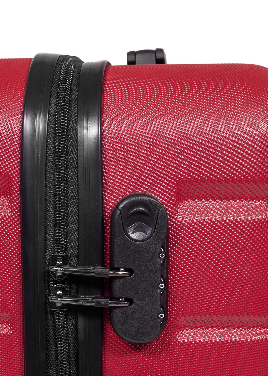 Duża walizka wykonana z bardzo lekkiego, wytrzymałego i odpornego na uszkodzenia materiału ABS w kolorze bordowym. Kółka pojedyncze, wykonane z mieszanki kauczuku i gumy, łożyskowane, obrót 360 stopni. Wewnątrz komora podzielona na dwie części, w jednej przestrzeń zamykana materiałem na suwak, w drugiej – elastycznymi pasami zabezpieczającymi. Walizka jest zaopatrzona w zamek numeryczny, teleskopową rączkę oraz gumowe uchwyty.
