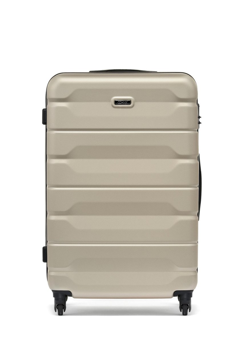 Duża walizka wykonana z bardzo lekkiego, wytrzymałego i odpornego na uszkodzenia materiału ABS w kolorze beżowym. Kółka pojedyncze, wykonane z mieszanki kauczuku i gumy, łożyskowane, obrót 360 stopni. Wewnątrz komora podzielona na dwie części, w jednej przestrzeń zamykana materiałem na suwak, w drugiej - elastycznymi pasami zabezpieczającymi. Walizka jest zaopatrzona w zamek numeryczny, teleskopową rączkę oraz gumowe uchwyty.