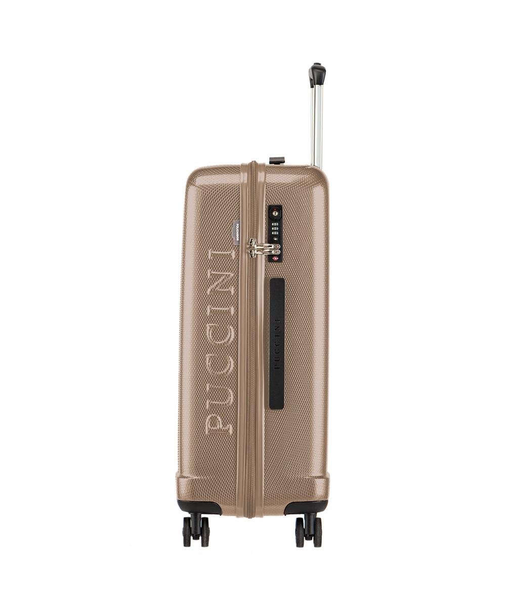 Kolekcja walizek Panama to doskonały wybór dla wymagających Klientów, którzy cenią sobie najwyższą jakość, funkcjonalność i perfekcję wykonania. Kolekcja została stworzona z odpornego na uszkodzenia, wysokiej jakości policarbonu o strukturze plastra miodu.Elegancki design walizek zachwyci niejednego miłośnika podróży. Kolekcję Panama charakteryzuje dbałość o detale. Na froncie walizki znajduje się oryginalna blaszka w kolorze srebra z wytłoczoną nazwą marki. Dodatkowo z boku walizki został umieszczony efektowny, wypukły napis Puccini. Model można przenosić w dłoni za pomocą uchwytów umieszczonych zarówno z boku jak i u góry walizki (rozmiar kabinowy posiada jedynie górny uchwyt). Dodatkowo posiada on trzystopniowy, aluminiowy stelaż umożliwiający dostosowanie wysokości rączki do indywidualnych potrzeb. Dzięki zwrotnemu układowi jezdnemu walizkę bez problemu można przemieścić w inne miejsce, bez względu na jakość nawierzchni. Cztery skrętne koła 360* ułatwiają manewrowanie walizką w trakcie jej prowadzenia. Dodatkowo walizka duża i średnia posiadają udogodnienie: cztery stopki ochronne umieszczone na prawym boku.Podróżując z modelem Panama możesz mieć pewność całkowitego bezpieczeństwa przewożonej zawartości. Wszystko za sprawą płaskiego zamka TSA, który ułatwia służbom lotniskowym zbadanie zawartości bagażu bez konieczności uszkadzania walizki. Skrupulatnie przemyślane wnętrze walizki zapewnia Państwu wygodę w pakowaniu i porządek podczas wyjazdu. Główna komora podzielona jest na dwie części. Pierwsza część posiada regulowane pasy, uniemożliwiające przesuwanie się garderoby. Drugą połowę zamyka przegroda na zamek, na której została umieszczona duża kieszeń. Komory wyściela granatowa, elegancka podszewka z nazwą marki Puccini.