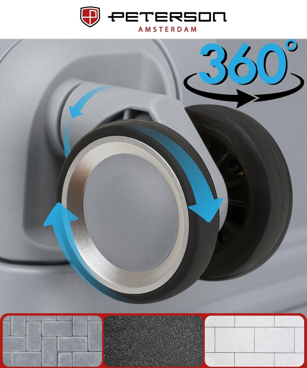 Walizka została wyposażona w cztery obrotowe kółka 360°, które zapewniają pełną swobodę ruchu i wyjątkowy komfort prowadzenia – niezależnie od nawierzchni.