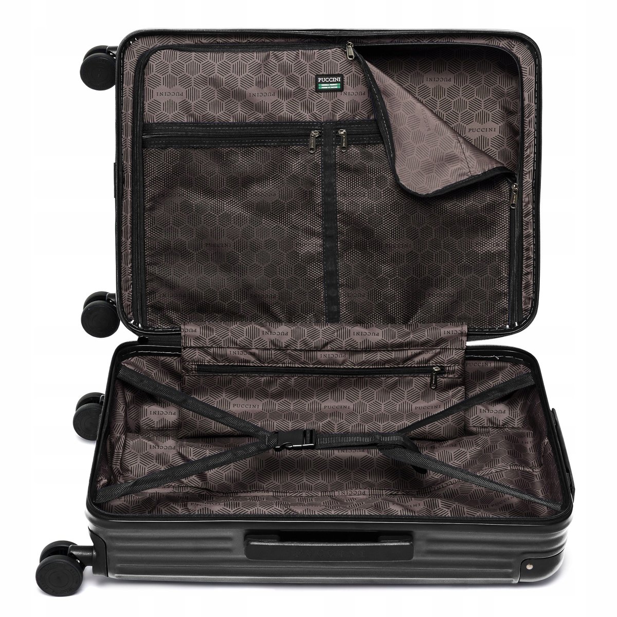 ➡️ Wewnętrzna przestrzeń została zaprojektowana tak, by maksymalnie ułatwić organizację – elastyczne pasy skutecznie stabilizują bagaż, a przezroczyste kieszenie zamykane na suwak pozwalają na wygodne przechowywanie drobnych przedmiotów.