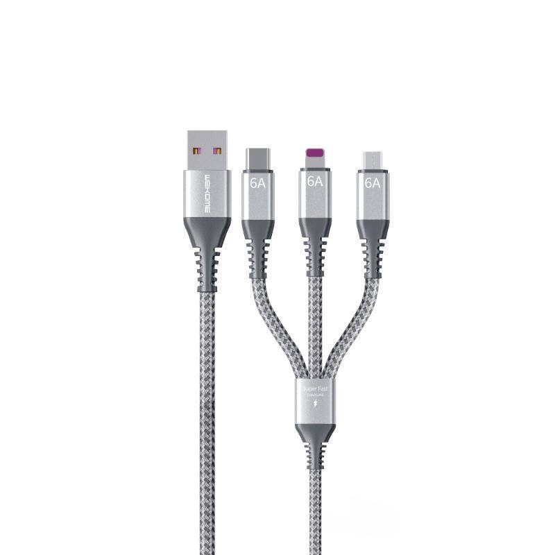Kabel 3w1 WEKOME WDC-170 Raython Series pozwala na jednoczesne podłączenie do portu USB-A trzech urządzeń wyposażonych w złącze Lightning, USB-C oraz Micro USB. Takie rozwiązanie umożliwia jednoczesne uzupełnienie energii w różnych urządzeniach.