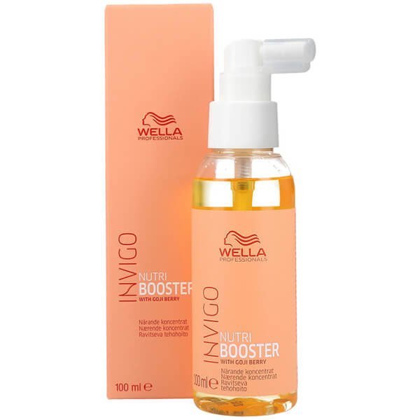 Odżywczy wzmacniacz Wella Invigo Nutri Booster uzupełnia kompleksową pielęgnację włosów suchych. Skoncentrowana formuła boostera potęguje działanie odżywki lub maski, aby jeszcze skuteczniej zregenerować i odżywić pasma, a przede wszystkim - dogłębnie je nawodnić, eliminując suchość, łamliwość i chropowatość. Po zastosowaniu tego kosmetyku pasma stają się pełne blasku, mocne, zabezpieczone przed czynnikami zewnętrznymi oraz uszkodzeniami mechanicznymi. Obecny w składzie ekstrakt z jagód goji chroni kosmyki przed przedwczesnym starzeniem, uelastycznia je i wygładza. Odżywczy wzmacniacz Wella Invigo Nutri Booster jest dla Ciebie, jeśli:
