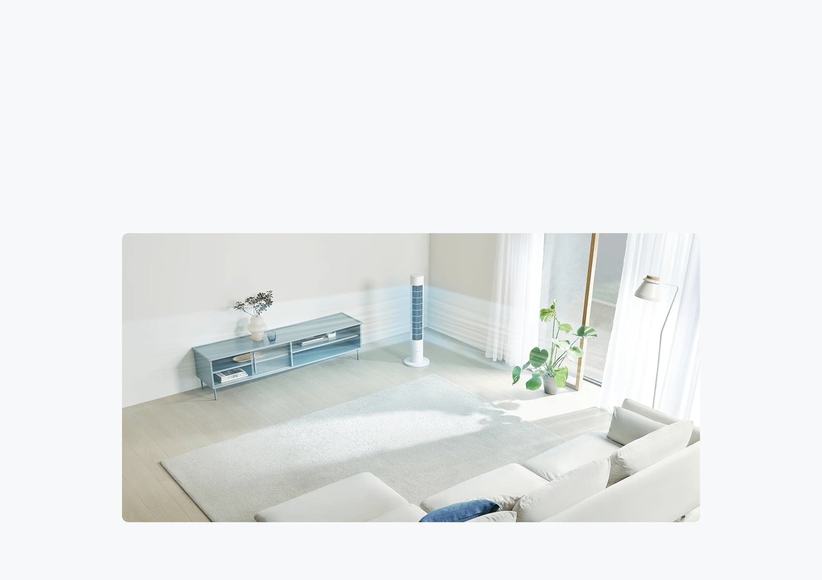 Naturalna bryza w zakresie 150° z delikatnym, otaczającym przepływem powietrza. Kontrola z aplikacji, smukła i elegancka konstrukcja - postaw go gdzie tylko zechcesz bez obaw o brak miejsca