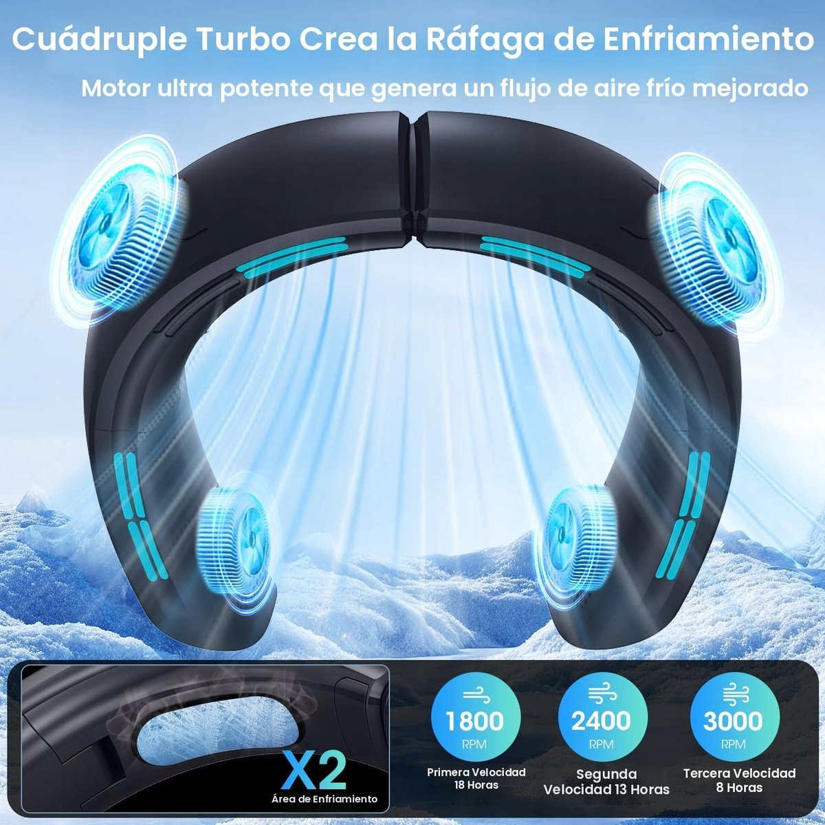 �️ OLV Ventilador de cuello 6000 mAh to przenośny, składany wentylator osobisty, który zapewnia przyjemne chłodzenie w każdej sytuacji. Dzięki czterem turbinom i przepływowi powietrza 360° poczujesz równomierny chłód wokół szyi i twarzy.