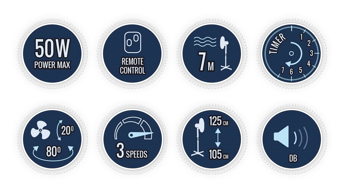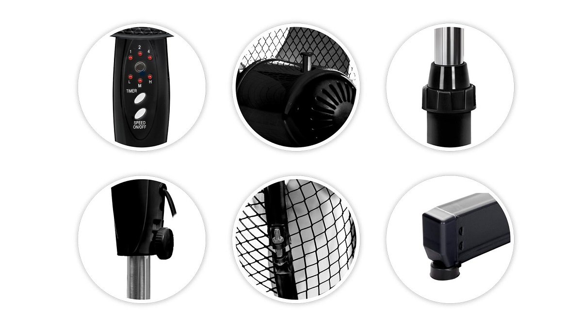 Wentylator stojący w kolorze czarnym. Posiada 3-stopniowe sterowanie pilotem lub manualne, bezpieczną kratkę maskującą i trzy łopatki śmigła o średnicy 40 cm.