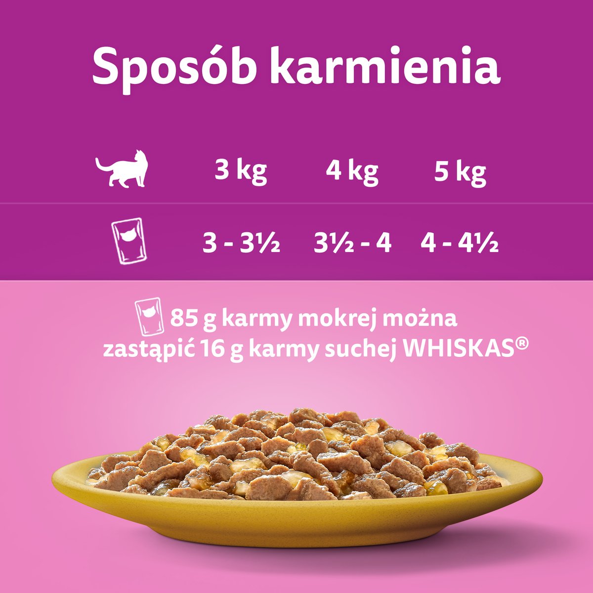Zalecana dzienna ilość karmy. Zalecamy podawać pełnoporcjową mokrą oraz suchą karmę Whiskas dla kota.
