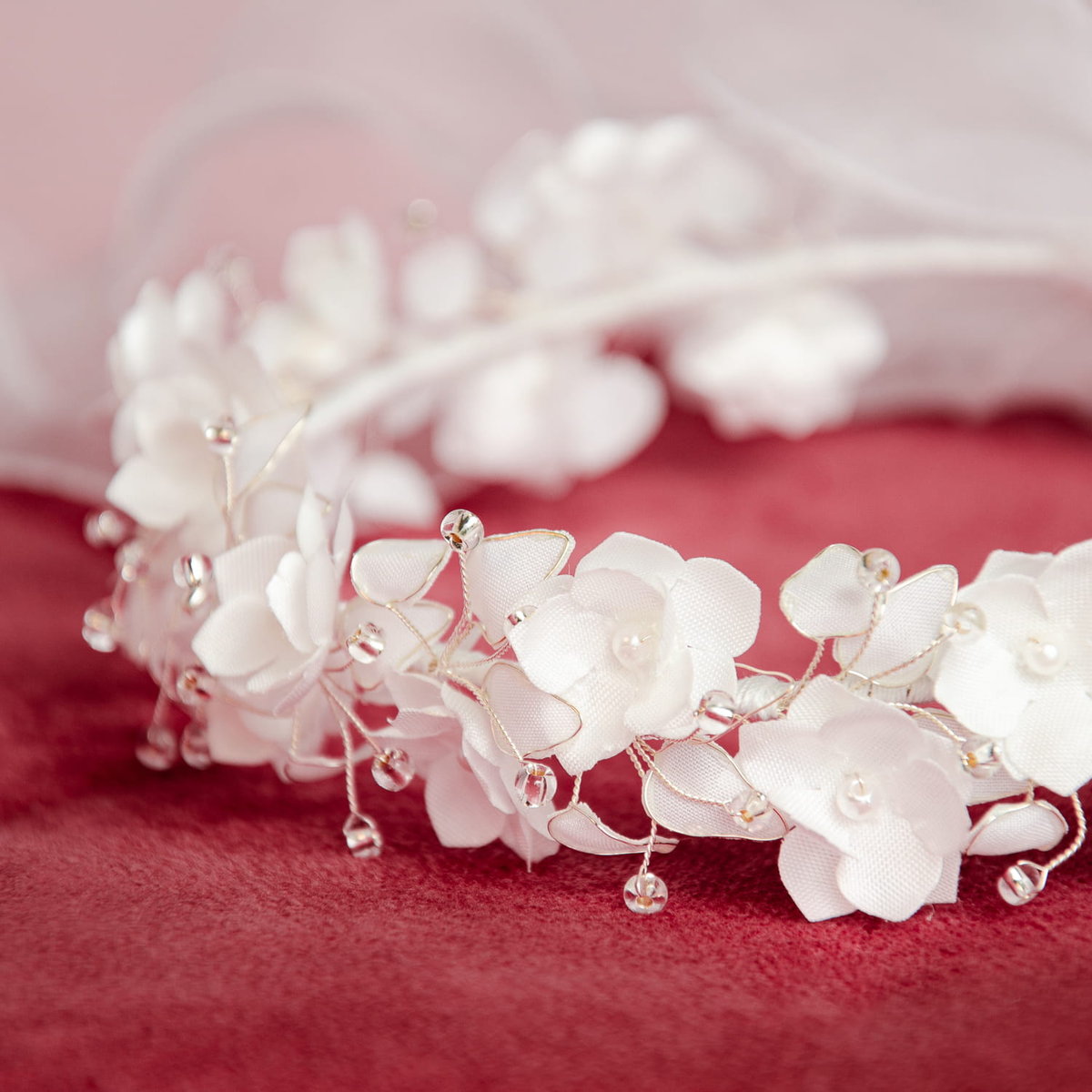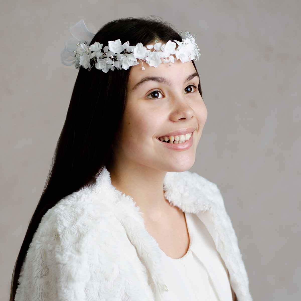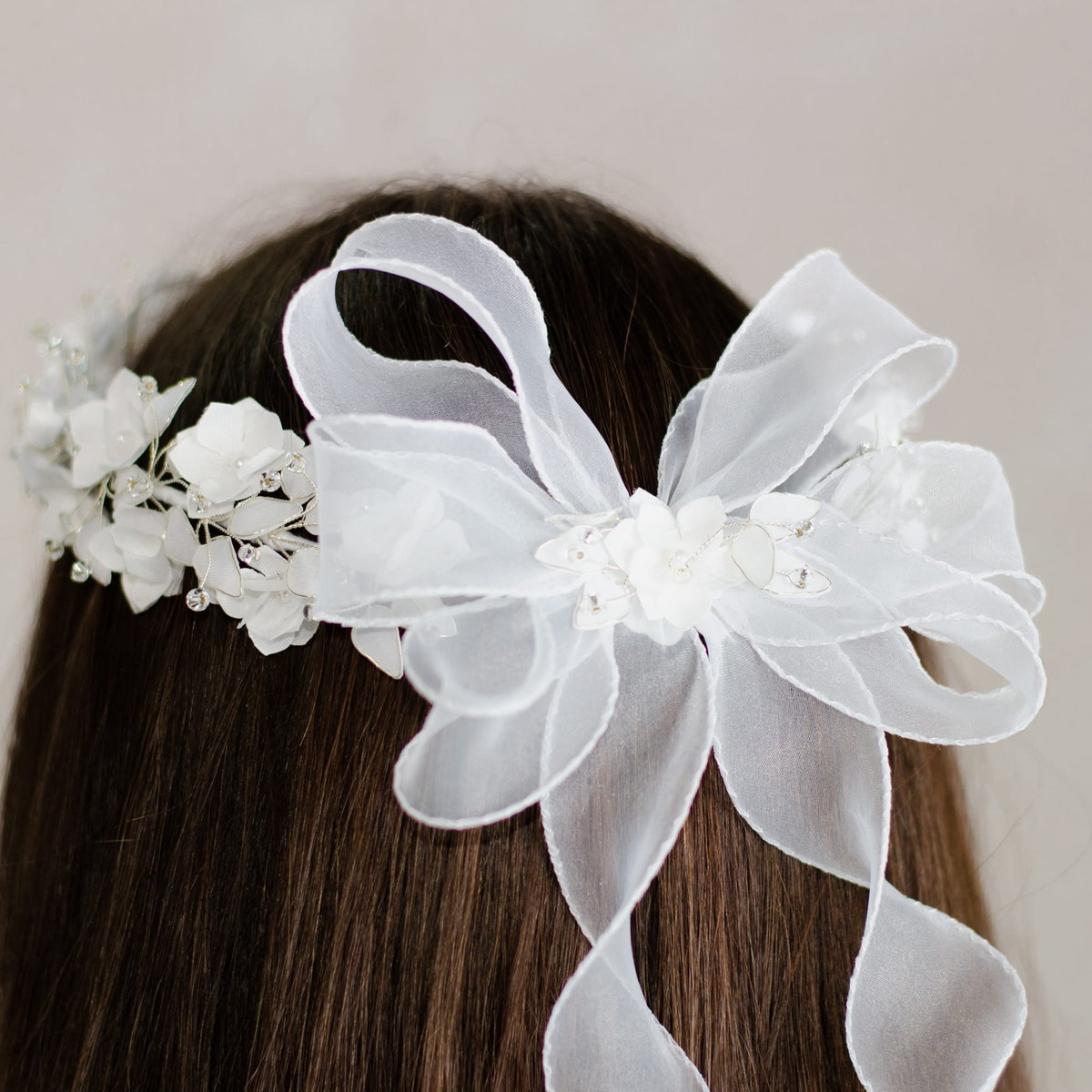 Bogato zdobiony biały wianek komunijny wykonany z drobnych kwiatuszków przyozdobionych małymi koralikami. Dodatkowo udekorowany cyrkoniami. Z tyłu znajduje się piękna kokarda ozdobiona kwiatuszkiem i listkami, od której odchodzą tiulowe wstążeczki, które pięknie prezentują się na włosach. Wianuszek pięknie prezentuje się zarówno na prostych włosach, jak i na upiętych.