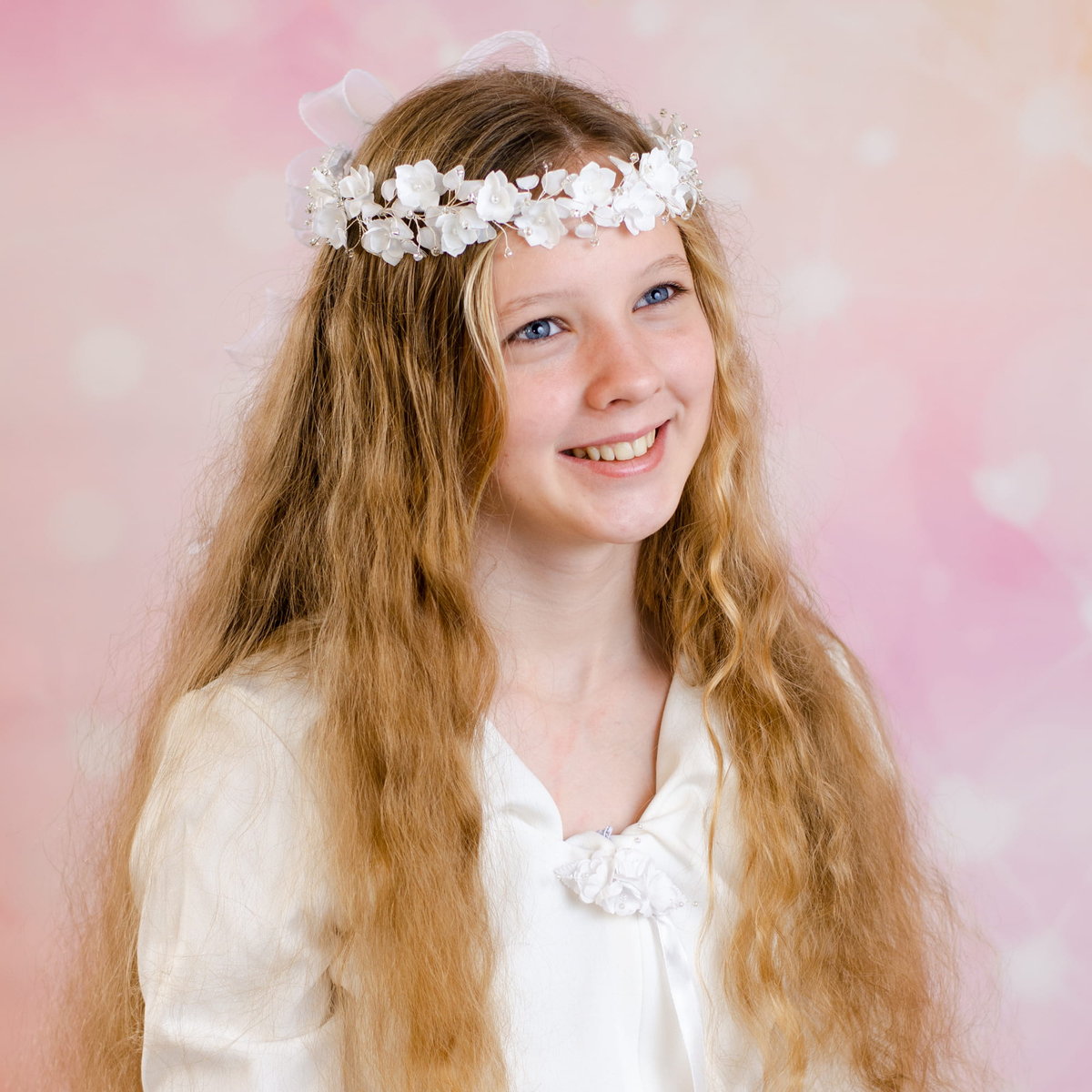 Bogato zdobiony biały wianek komunijny.
