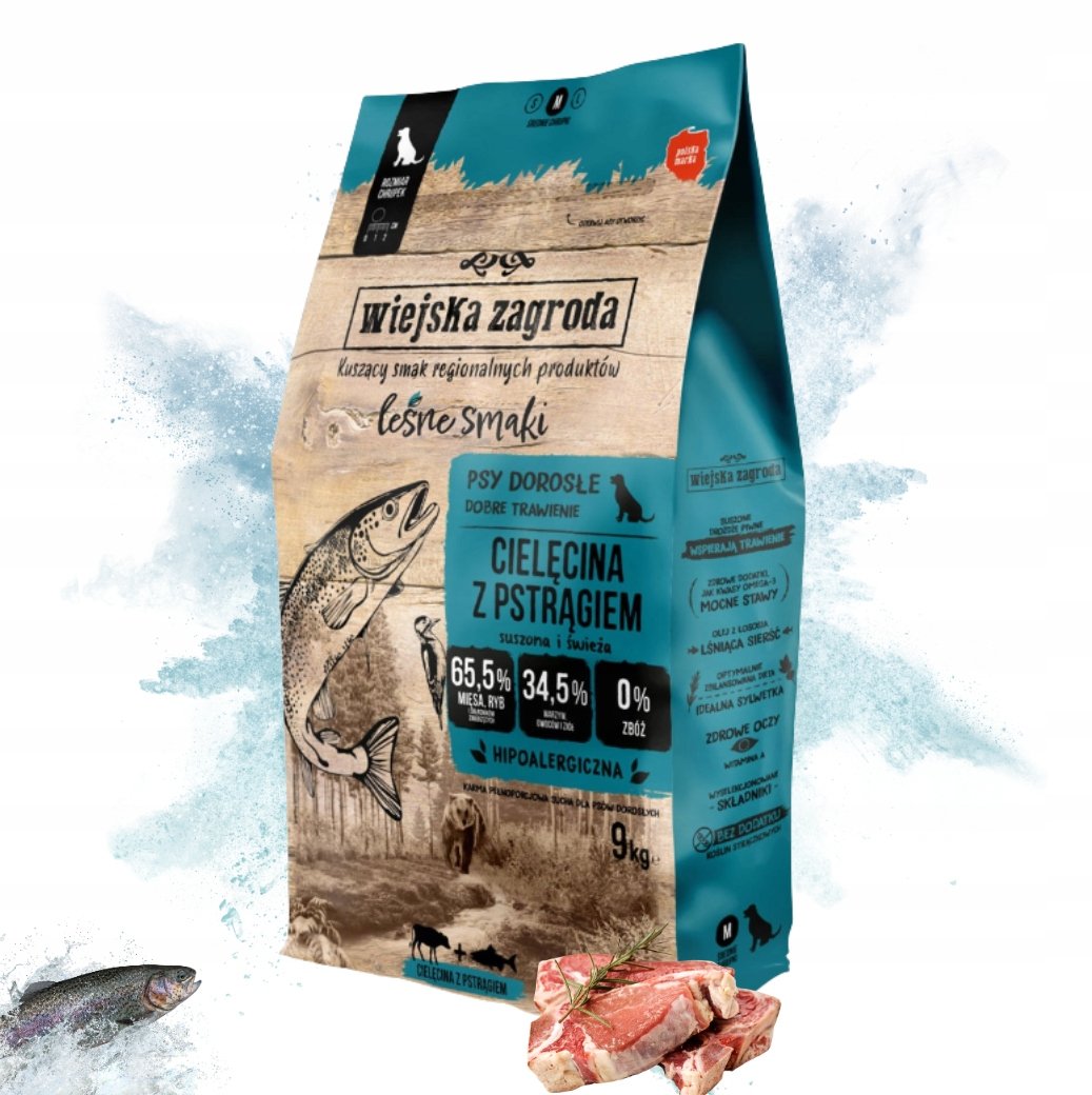 WIEJSKA ZAGRODA CIELĘCINA Z PSTRĄGIEM – NATURALNA KARMA DLA RAS ŚREDNICH 9KG✔️ BEZ ZBÓŻ✔️65,5% MIĘSA I RYB✔️DLA ŚREDNICH RAS ✅ ZDROWE SKŁADNIKI Z LOKALNYCH GOSPODARSTW► 65,5% ...