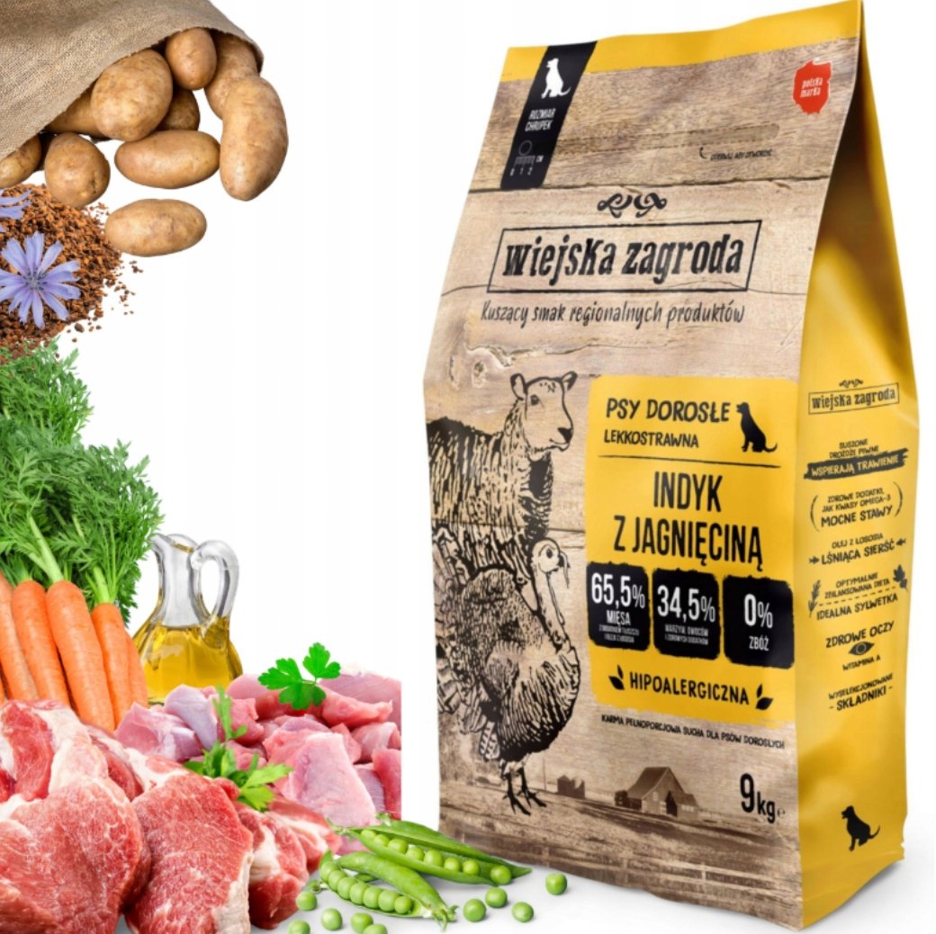 WIEJSKA ZAGRODA INDYK Z JAGNIĘCINĄ – NATURALNA KARMA DLA PSA M 9KG✔️ BEZ ZBÓŻ✔️65,5% MIĘSA✔️DLA ŚREDNICH RAS ✅ ZDROWE SKŁADNIKI Z LOKALNYCH GOSPODARSTW► 65,5% mięsa (świeży i ...