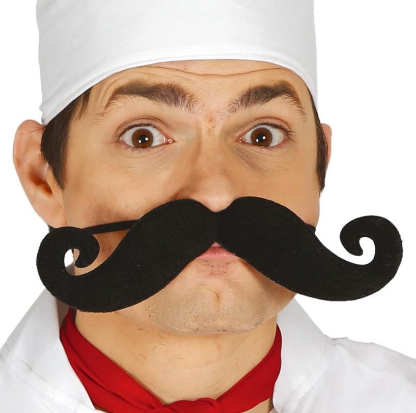 Wielkie wąsy, Włoski Kucharz, czarne wykonane z czarnego, miłego w dotyku materiału posiadają gumkę, która utrzymuje wąs na miejscu szerokość wąsów: 20 cm