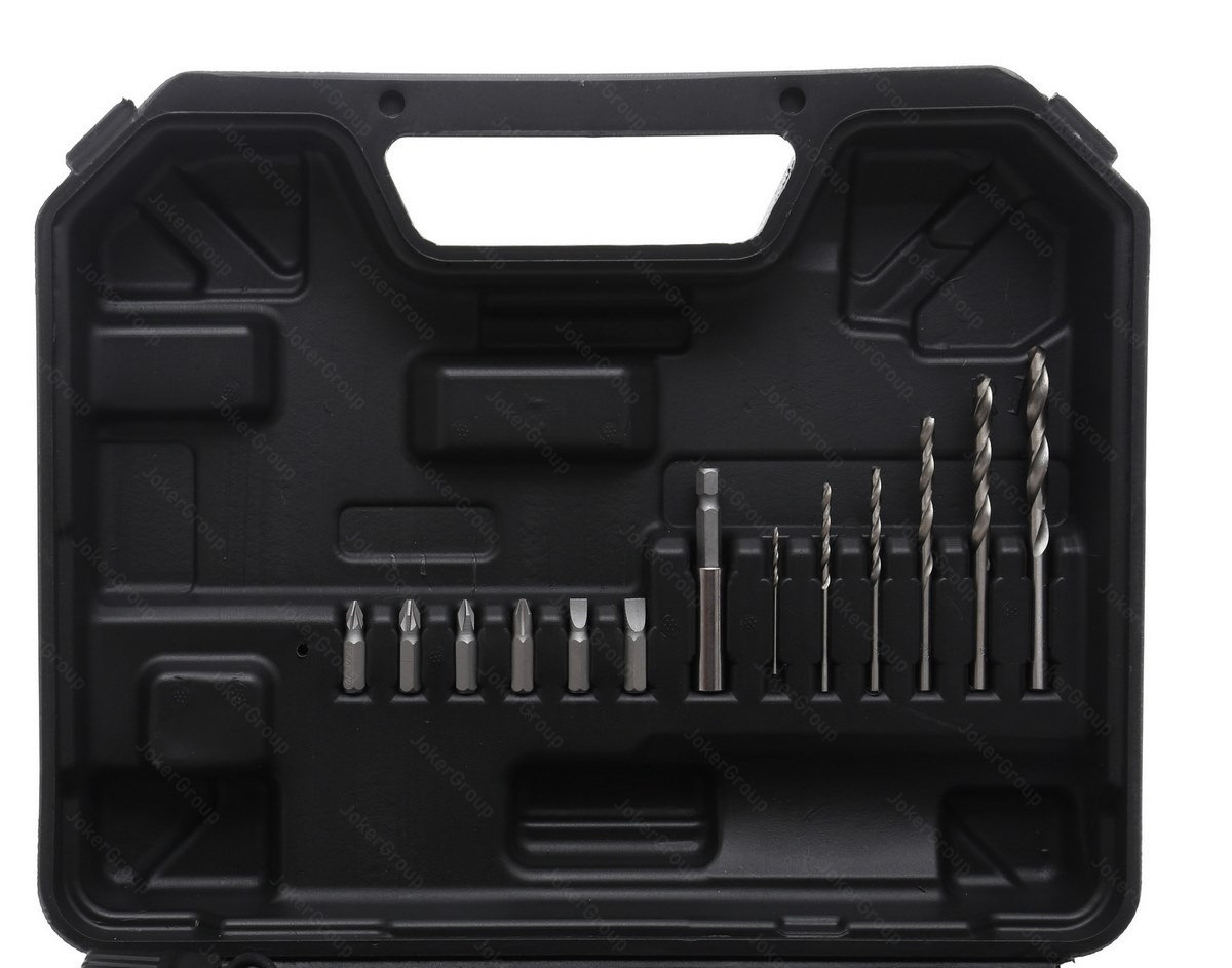- zestaw zawiera: akumulator, ładowarkę, 6 bitów, 6 wierteł, uchwyt do bitów 1/4"