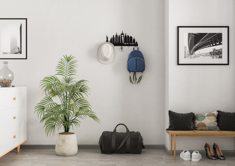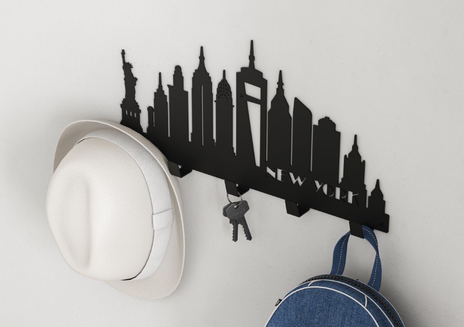 Wieszak na ubrania z panoramą Nowego Jorku. Oryginalny wieszak ścienny wykonany z wycinanej laserowo blachy malowanej proszkowo na kolor czarny. Wpasuje się w przestrzeń przedpokoju w stylu nowoczesnym czy loftowym. Wieszak jest wyjątkowym elementem dekoracyjnym i praktycznym.