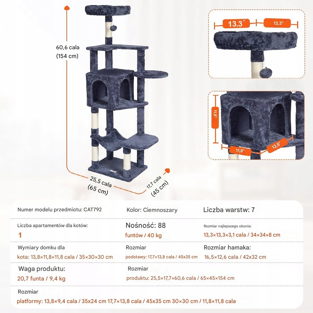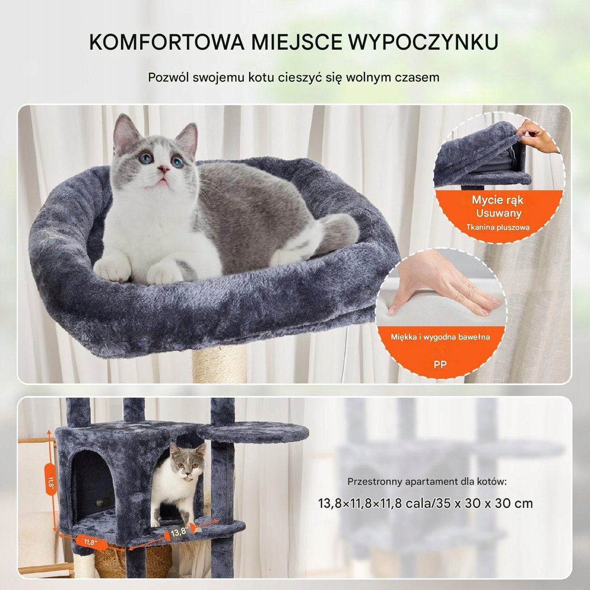 Wieża dla kota zawiera przestronne mieszkanie dla kota, górną grzędę i hamak, zapewniając prywatne i bezpieczne środowisko do odpoczynku. Istnieje wiele platform, na których koty mogą swobodnie wybierać miejsce do zabawy i odpoczynku. Miękkie pluszowe powierzchnie są delikatne dla skóry i pazurów kotów, zapewniając im komfortowe warunki do wylegiwania się.