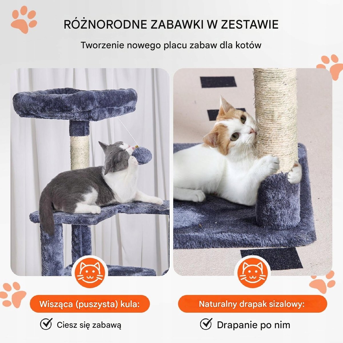Wiszące zabawki w kształcie piłek i sprężynowe piłki na drapaku przyciągają uwagę kotów, stymulując je do zabawy. Owinięte sizalem drapaki pozwalają kotom rozciągać się i ćwiczyć, zapewniając im aktywność, łagodząc nudę i stres oraz zapobiegając uszkodzeniom mebli.