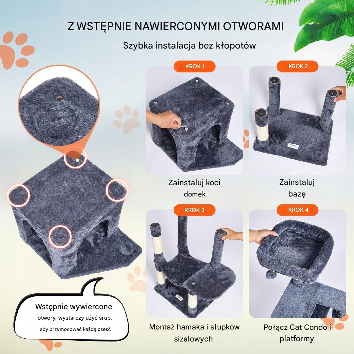 Wstępnie wywiercone otwory ułatwiają instalację. Nasze drapaki dla kotów są dostarczane ze szczegółowymi instrukcjami montażu i wszystkimi niezbędnymi śrubami, wkrętami, kluczami i zestawami śrub rozporowych. Nawet początkujący użytkownicy mebli dla zwierząt domowych mogą z łatwością dokończyć konfigurację, oszczędzając czas i wysiłek.