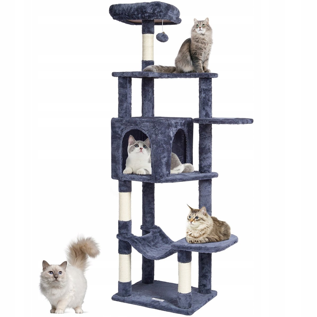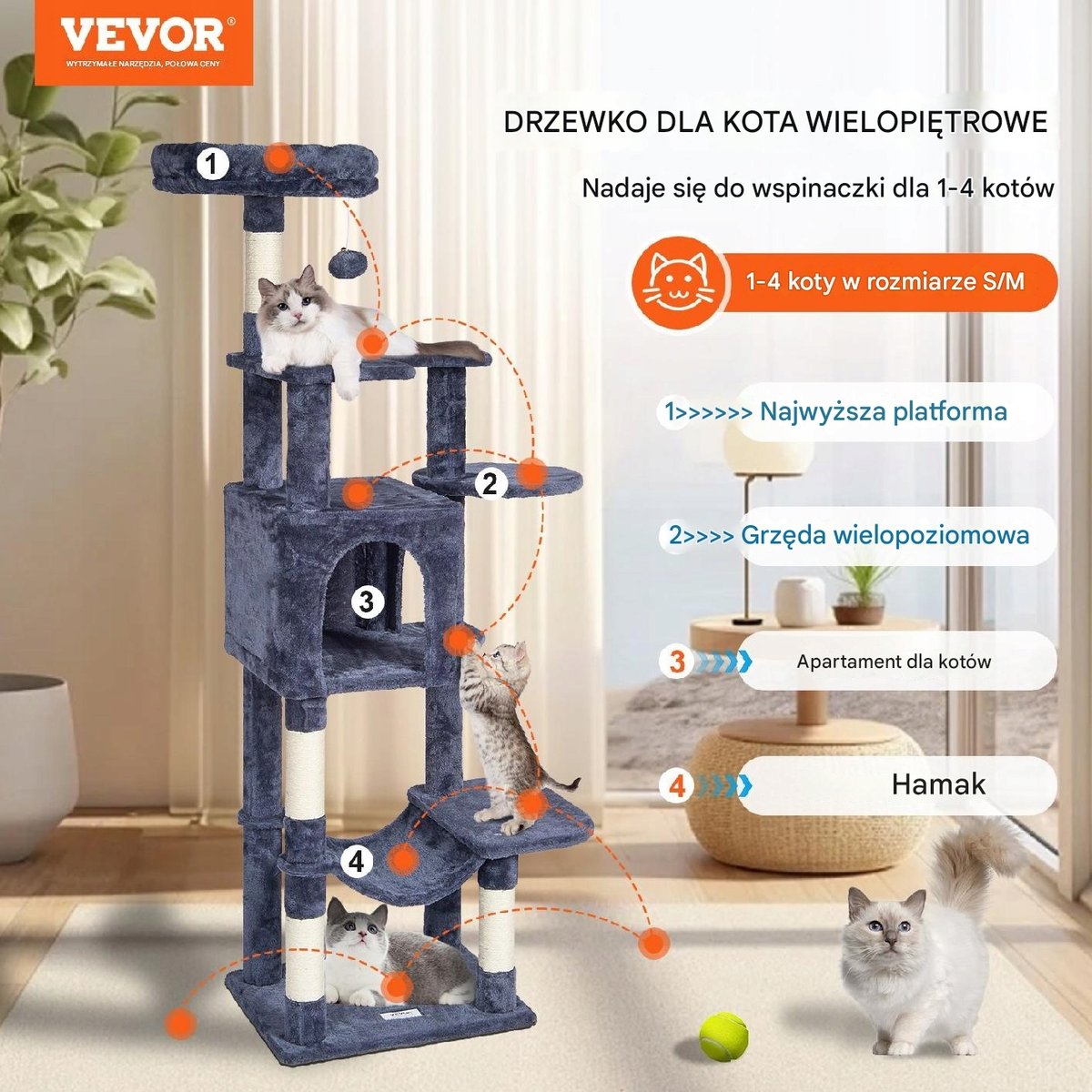 Dzięki zwisającym zabawkom i słupkom owiniętym sizalem koty mogą swobodnie się bawić, zmniejszając stres i nudę, a jednocześnie dbając o zdrowe pazury. Liczne platformy zapewniają radość ze wspinania, pomagając kotom pozostać aktywnymi i pełnymi energii. Twoje koty będą spędzać tu radosne dni.