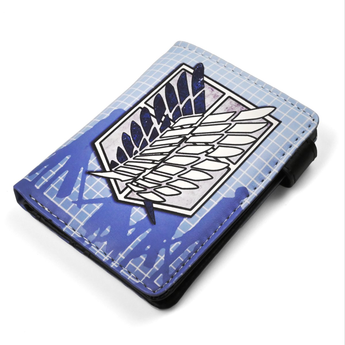 Wykonany z wysokiej jakości skóry ekologicznej portfel o wymiarach 12 cm łączy trwałość z estetyką inspirowaną anime. Zewnętrzna strona przyciąga wzrok niebieską kolorystyką z kratkowanym tłem, sylwetkami głównych bohaterów oraz charakterystycznym symbolem Skrzydeł Wolności w bieli i granacie. Wewnątrz znajdują się praktyczne przegródki na karty, okienko na dokumenty oraz zapinana na suwak kieszeń na monety – wszystko, co potrzebne na co dzień.