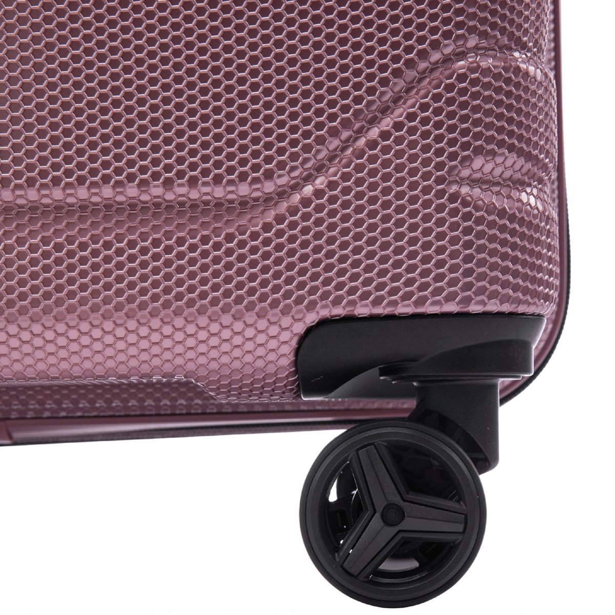 Jej wyjątkowa powierzchnia w formie plastra miodu nie tylko przyciąga uwagę, ale również zwiększa odporność na uderzenia, zapewniając dłuższą żywotność. Elegancki i nowoczesny charakter walizki podkreśla perfekcyjnie dopasowany zamek posiadający przeszycia nitką, w tym samym kolorze co korpus walizki.