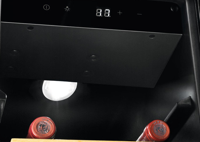 Urządzenie do przechowywania wina do zabudowy o pojemności użytkowej 58 l (mieści 20 butelek), w klasie efektywności energetycznej G. Elektroniczne sterowanie, wewnętrzne oświetlenie LED. Witryna ELECTROLUX EWUS020B5B 923421298 wyposażona została w 6 drewnianych półek.