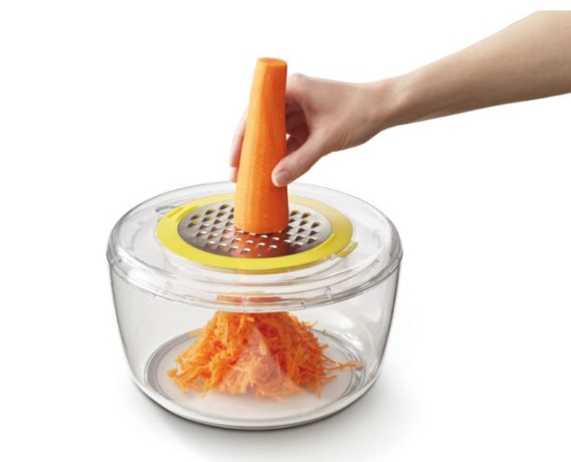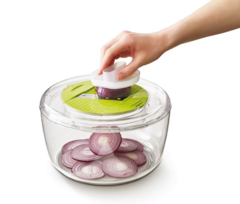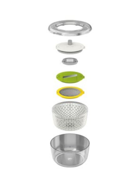 Urządzenie nie tylko odwirowuje sałatę, ale także posiada nakładki do ścierania i plastrowania, które są przechowywane wewnątrz obudowy.