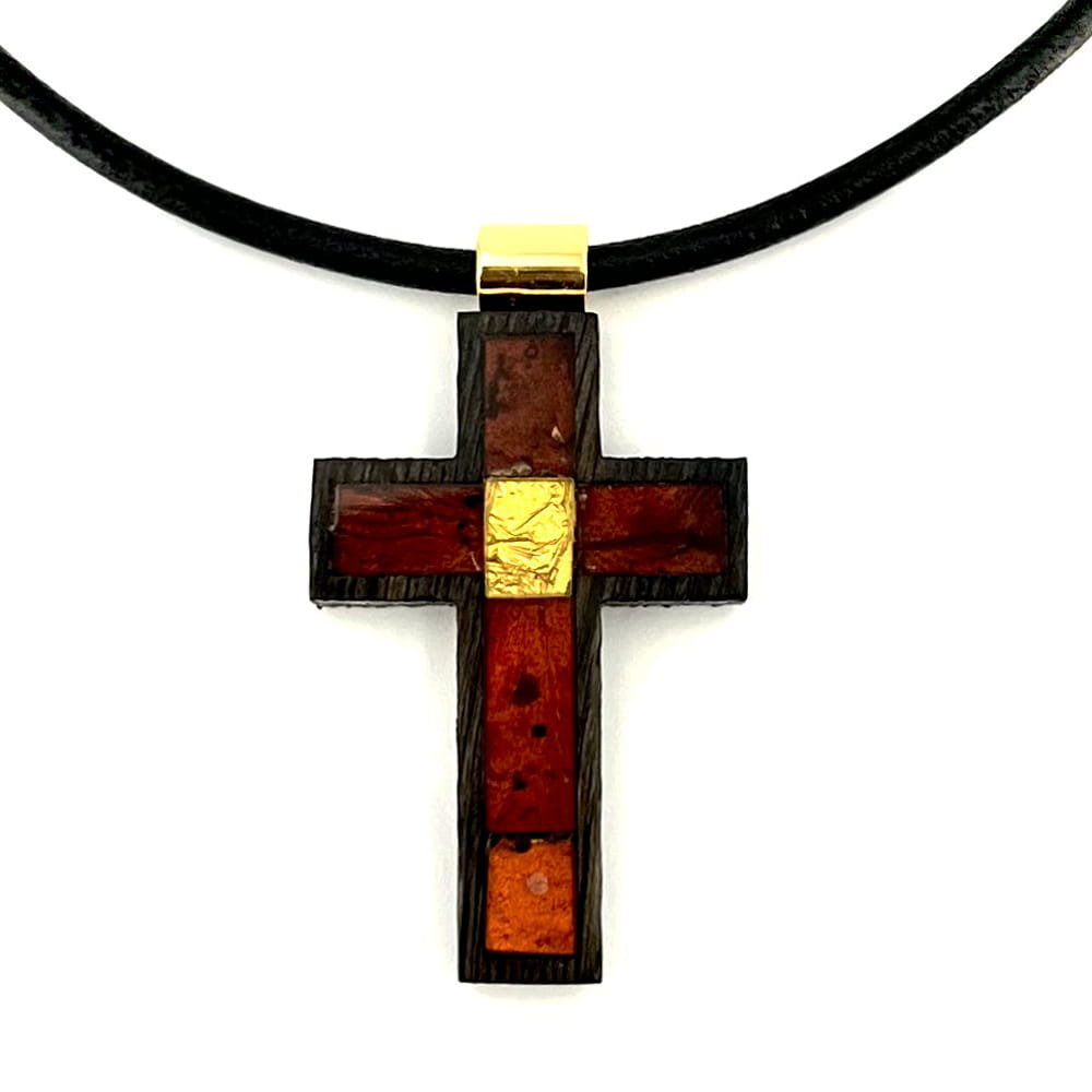 Wisiorek krzyżyk wykonany ręcznie z wyselekcjonowanego bursztynu bałtyckiego, srebra wysokiej próby pozłacanego 24 karatowym złotem, złota płatkowego pod bursztynem oraz szlachetnego drewna czarnego dębu.