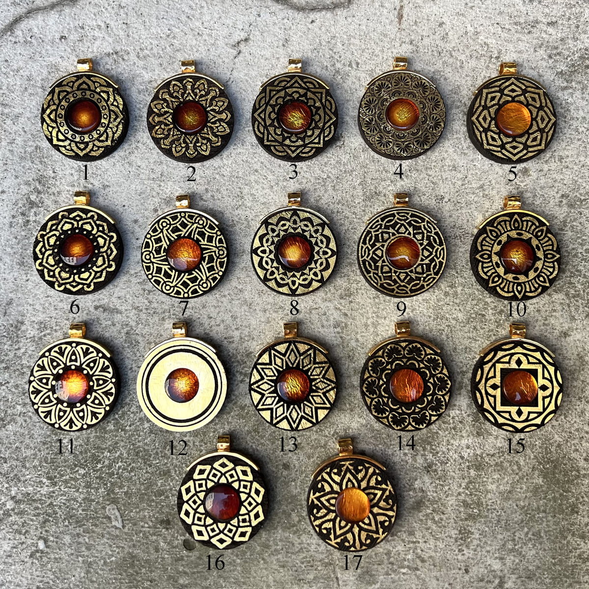 Wisior mandala o okrągłym kształcie i bajecznym wzorem został wykonany z bursztynu, srebra próby 925, złota płatkowego 23 karatowego oraz szlachetnego czarnego dębu.