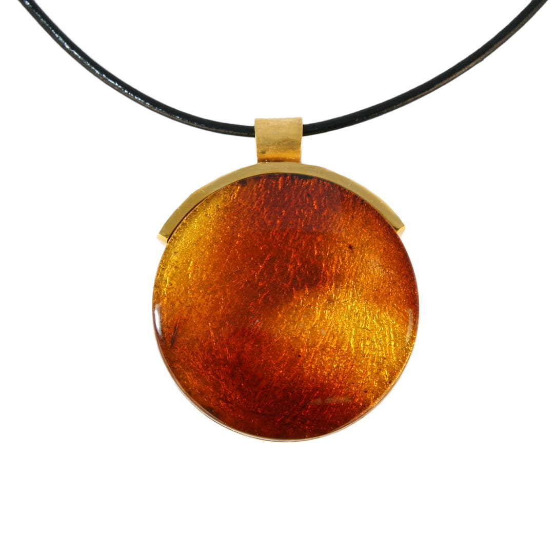 Wisiorek okrągły wykonany ręcznie z wyselekcjonowanego bursztynu bałtyckiego, srebra pozłacanego 24 karatowym złotem, złota płatkowego pod bursztynem oraz szlachetnego drewna.