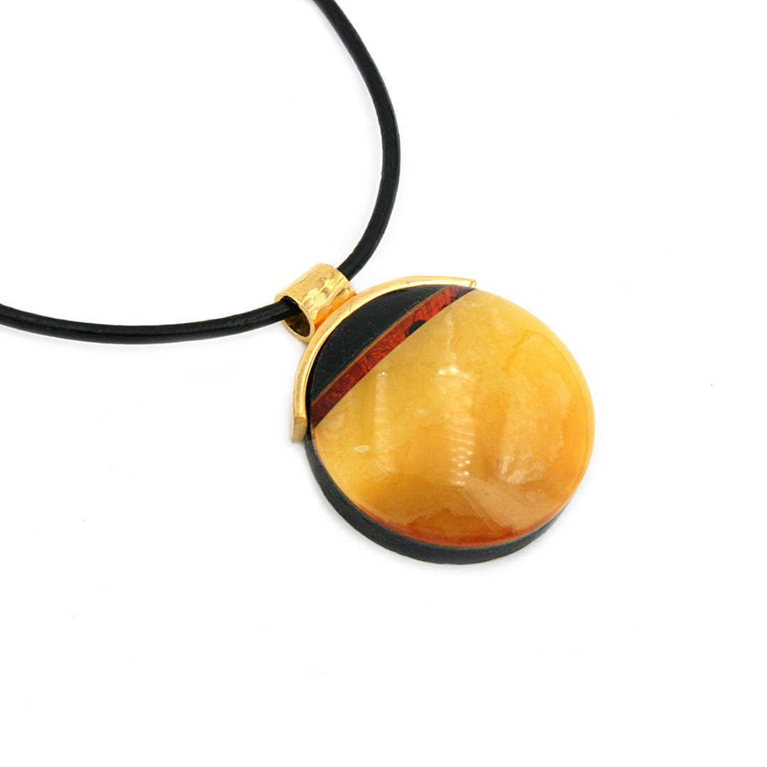 Wisiorek okrągły wykonany ręcznie z wyselekcjonowanego bursztynu bałtyckiego w kolorze żółtym, srebra pozłacanego 24 karatowym złotem, złota płatkowego pod bursztynem oraz szlachetnego drewna.