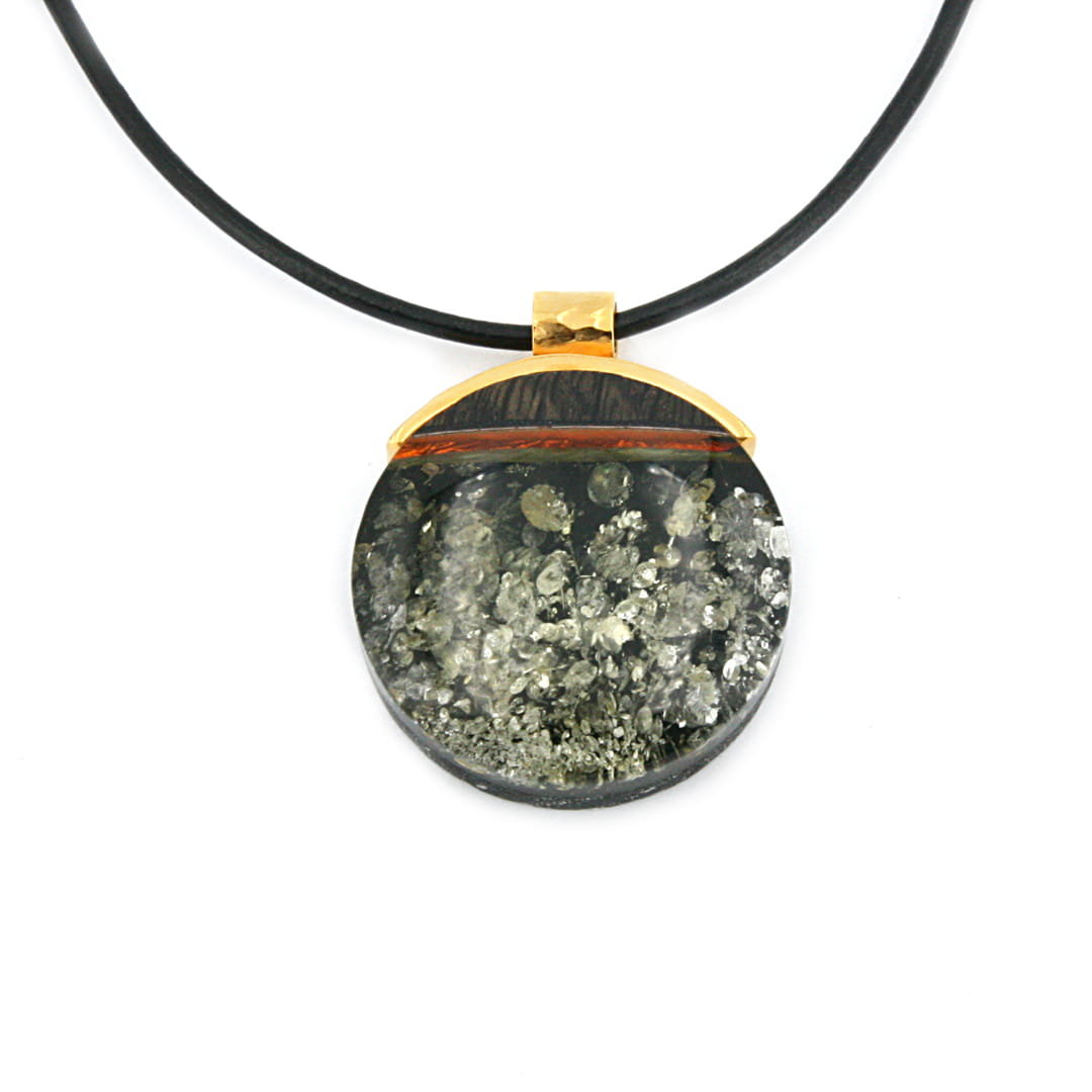 Wisiorek okrągły wykonany ręcznie z wyselekcjonowanego bursztynu bałtyckiego w kolorze zielonym, srebra pozłacanego 24 karatowym złotem, złota płatkowego pod bursztynem oraz szlachetnego drewna. ...
