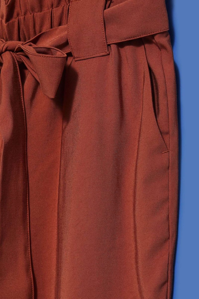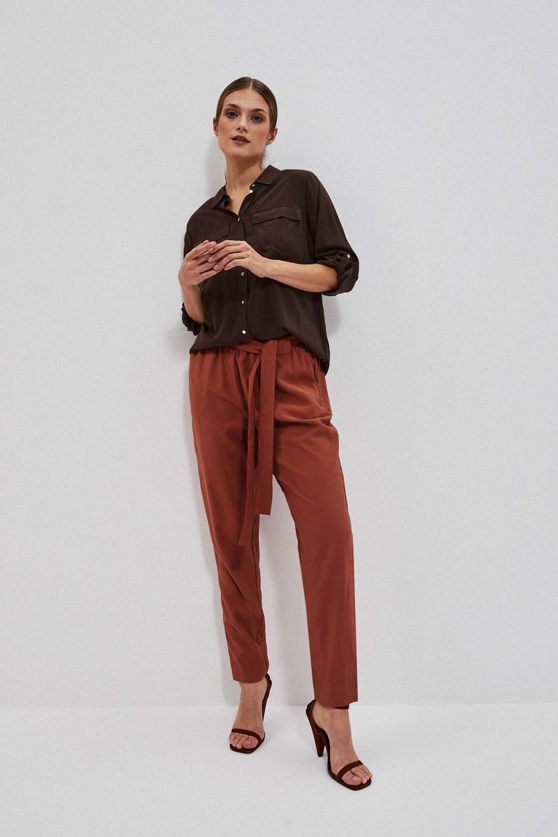 85%WISKOZA, 15%POLIESTER Damskie spodnie w kolorze brązowym. Gładkie, bez wzorów. Średni stan, W pasie guma i dodatkowo pasek który można przewiązać. Z przodu oraz z tyłu dwie wsuwane kieszenie. Długie i proste nogawki, niekrepujące ruchów. Wykonane z wiskozy dzięki czemu są idealne na letnie dni, bardzo komfortowe w noszeniu i przewiewne. Świetnie pasują do letnich koszul.