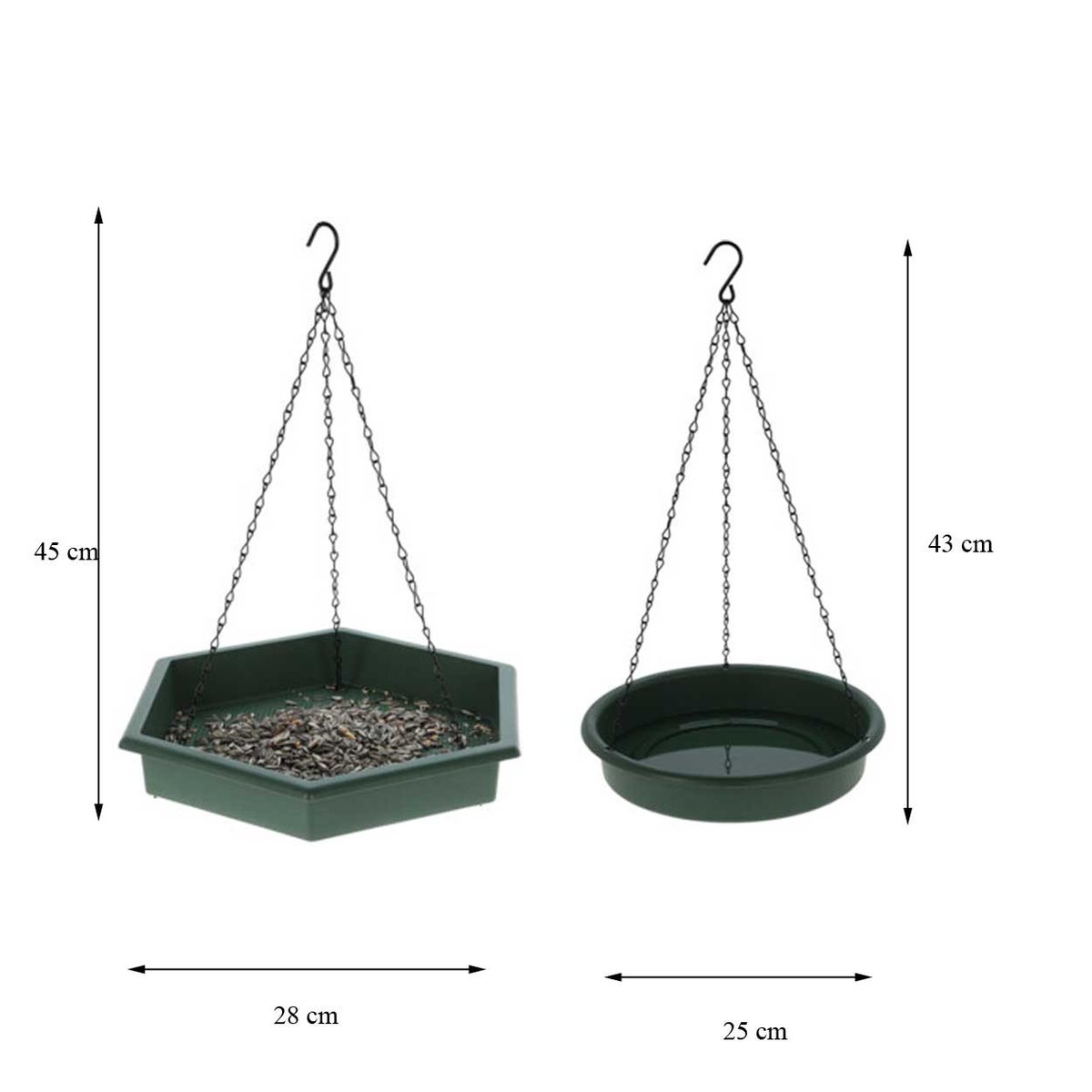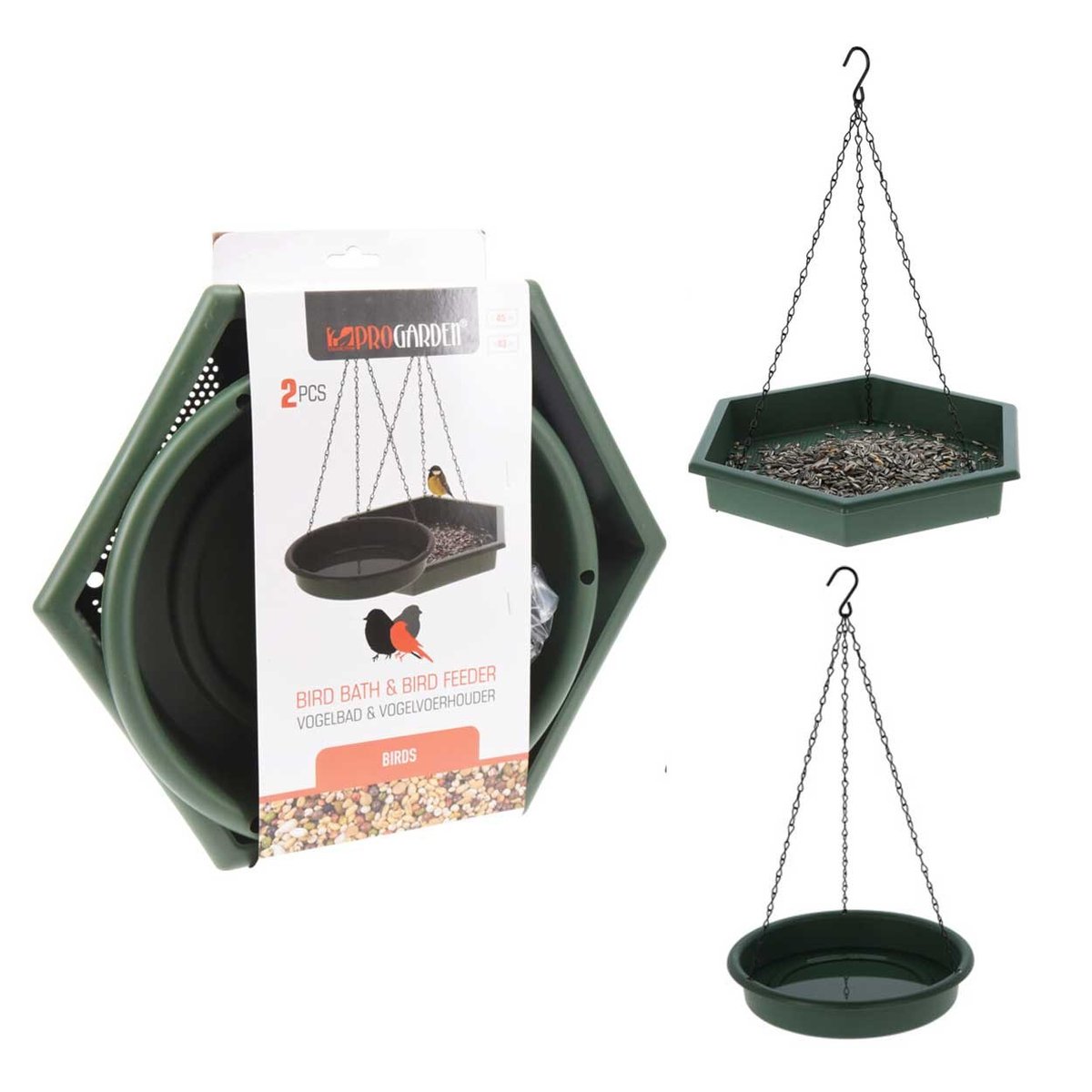 W skład zestawu wchodzą dwa elementy: heksagonalny karmnik z małymi otworami w podstawie (wymiary 32x28x4,5 cm), które zapobiegają gromadzeniu się wody oraz okrągłe poidełko o średnicy 24,8 cm i wysokości 4,3 cm, idealne do picia lub kąpieli ptaków.