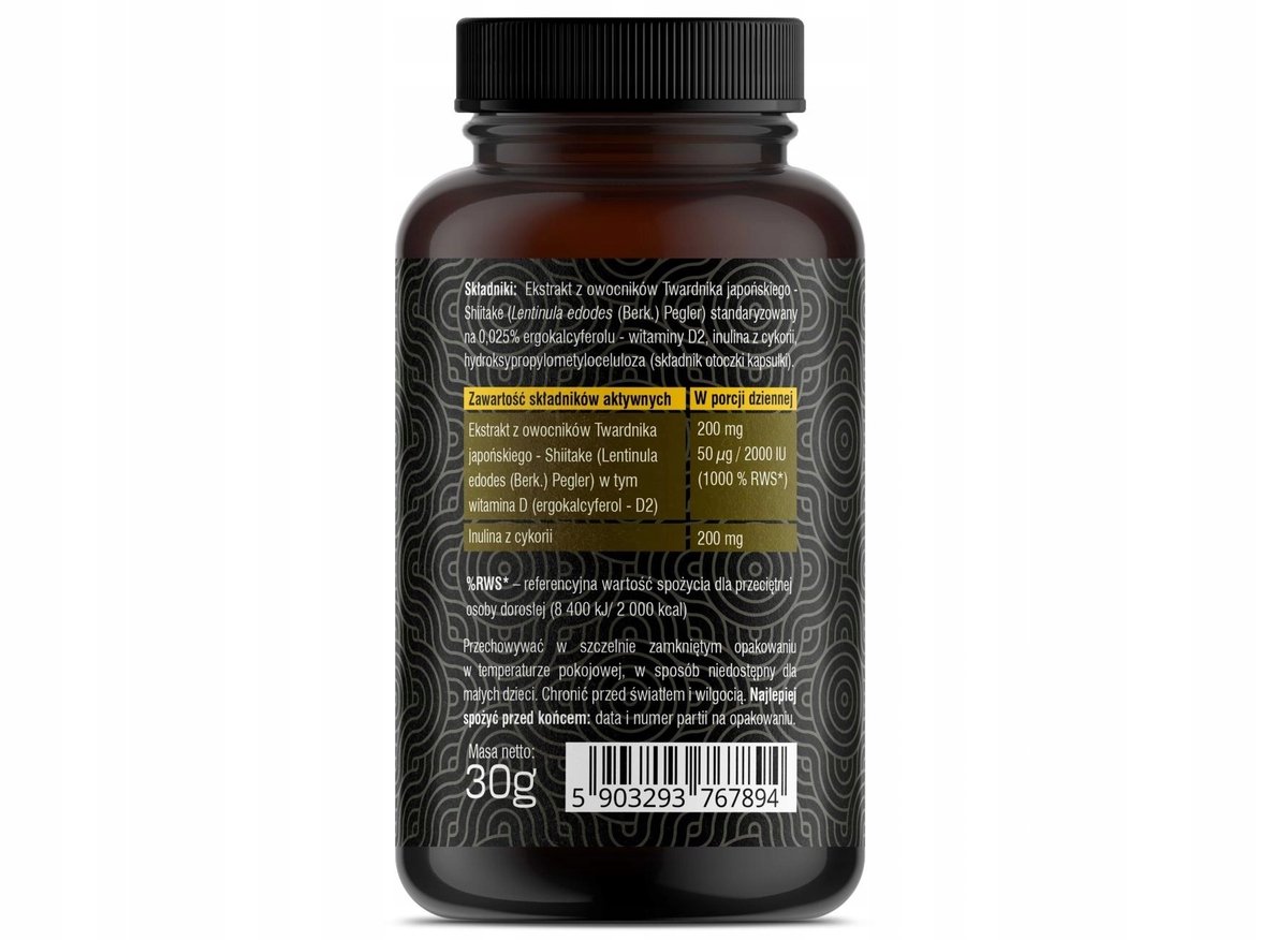 Ekstrakt z owocników Twardnika japońskiego - Shiitake (Lentinula edodes (Berk.) Pegler) standaryzowany na 0,025% ergokalcyferolu – witaminy D2, inulina z cykorii, hydroksypropylometyloceluloza (składnik otoczki kapsułki).