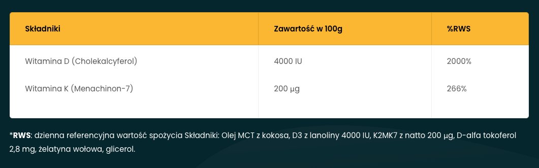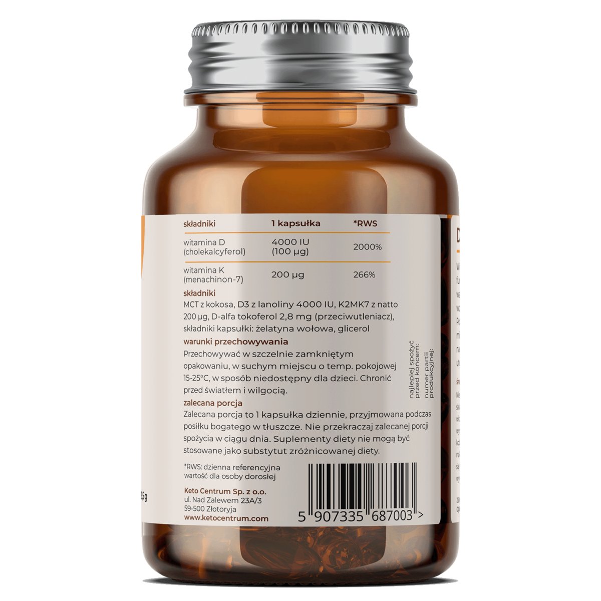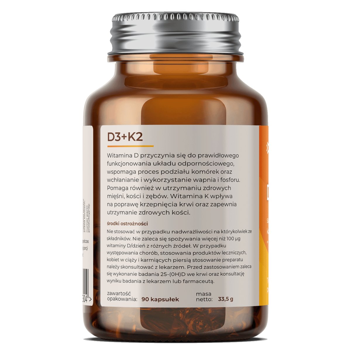 Opakowanie zawiera 90 kapsułek witaminy D3 z K2 w oleju MCT – każda kapsułka zawiera 4000 IU witaminy D oraz 200 μg witaminy K.