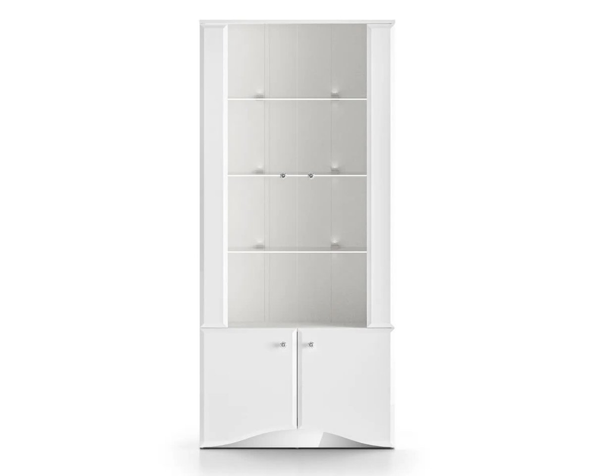 Biel w wysokim połysku, ozdobne uchwyty i subtelna trójwymiarowość frontów nadają witrynie eleganckiego charakteru i sprawiają, że idealnie dopełni ona wnętrza w stylu glamour, modern classic lub minimalistycznym. Dodatkowe oświetlenie (opcjonalne) pozwala wyeksponować zawartość witryny wieczorem, budując przytulną i nastrojową atmosferę.