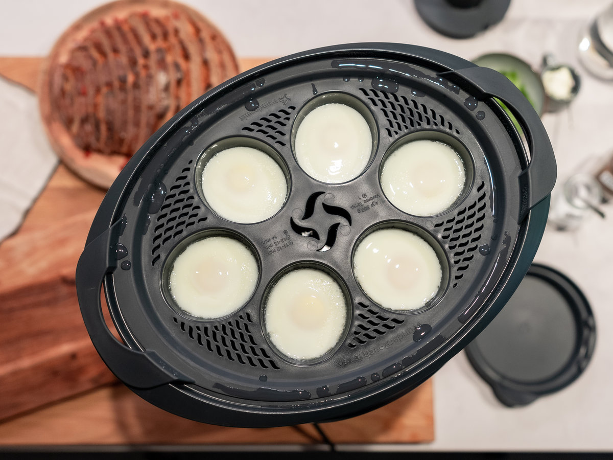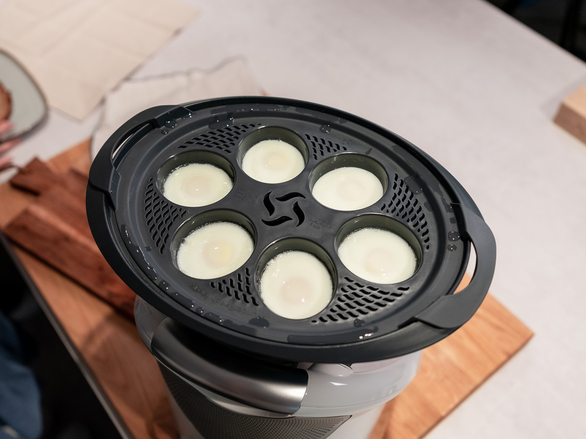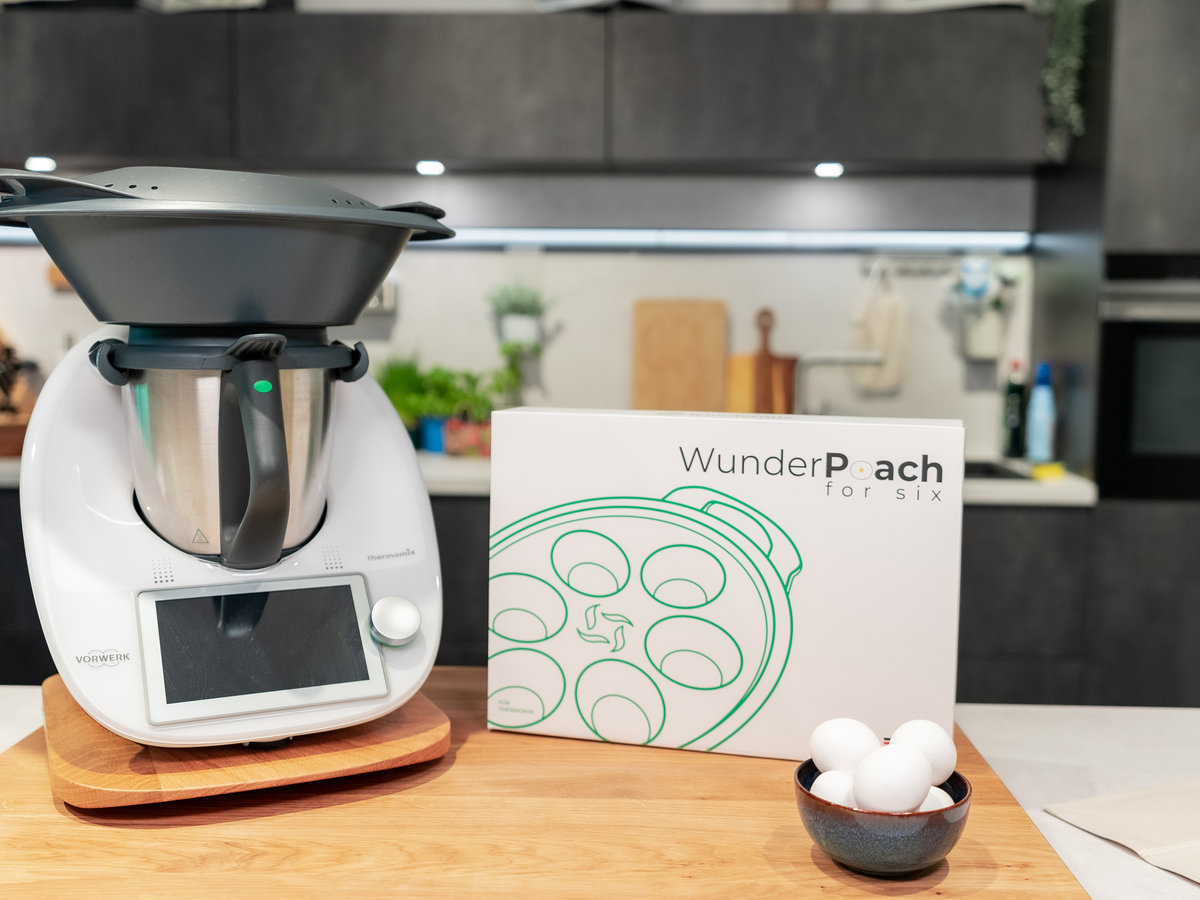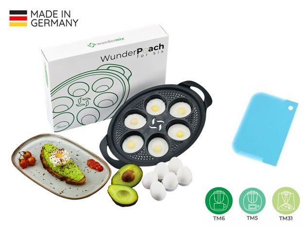 Dzięki niemieckiej wkładce WunderPoach dla sześciu osób firmy Wundermix można jednocześnie ugotować 6 jajek w Thermomixie.