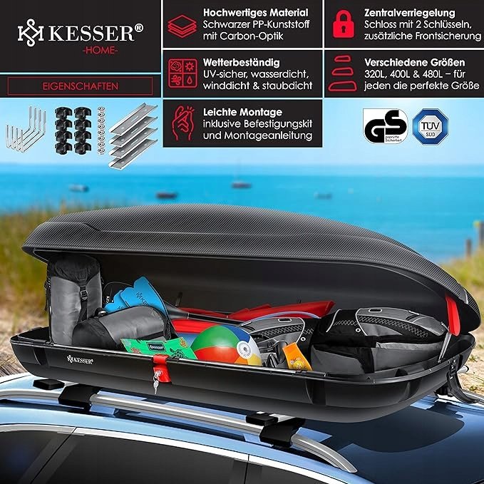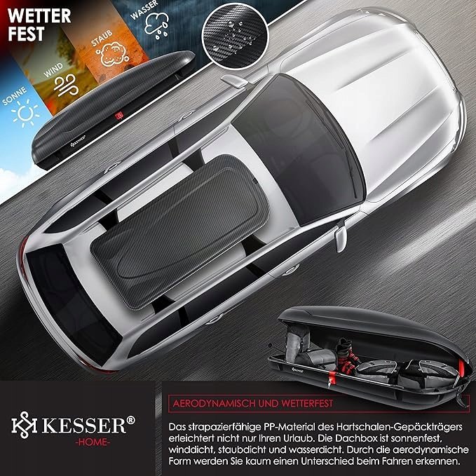 ÄWykonany z wytrzymałego, czarnego tworzywa sztucznego PP o atrakcyjnym wyglądzie karbonu. Materiał jest odporny na warunki atmosferyczne i chroni bagaż przed promieniowaniem UV, deszczem, wiatrem i kurzem. Dzięki temu box dachowy jest wyjątkowo trwały i solidny. Dlatego wodoodporny box dachowy jest idealny na każdą porę roku – zarówno zimą, jak i latem!