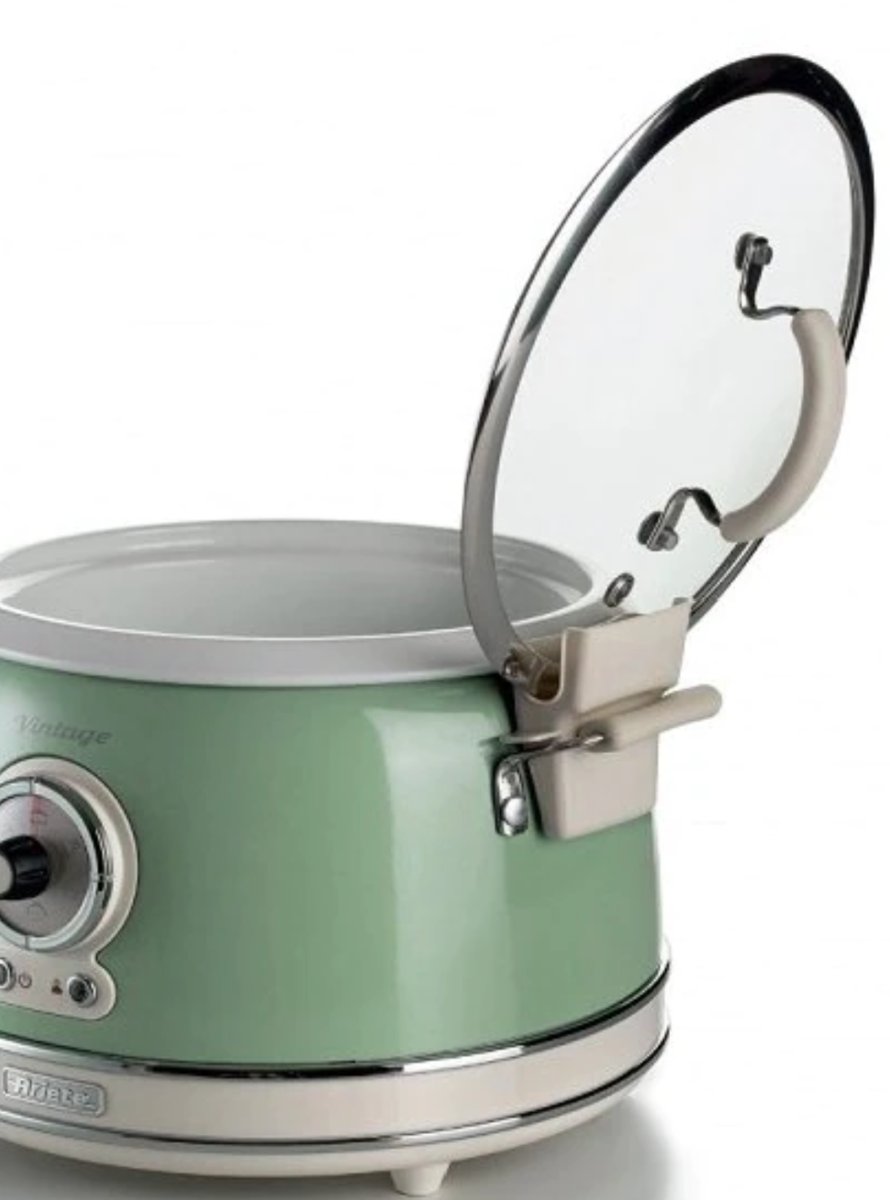 Wolnowar Ariete 2904/04 Vintage w kolorze zielonym to urządzenie, które skradnie Twoje serce i dopieści Twoje zmysły. Tryb powolnego gotowania sprawia, że przygotowane posiłki zachowują maksimum wartości odżywczych, a zapachy przenikają się w sposób, którego nie uzyskasz gotując tradycyjnie. Takie gotowanie to wielka oszczędność czasu – umieszczasz potrawy w misce, włączasz tryb wolnego gotowania, a Ty zyskujesz kilka godzin dla siebie. Potrawa gotuje się w temperaturze do 98 stopni, przez co nie ma możliwości, że danie przypali się lub sos wyparuje. Zachwyć się przepysznym gulaszem wołowym czy kanapkami po wietnamsku z szarpaną wieprzowiną.