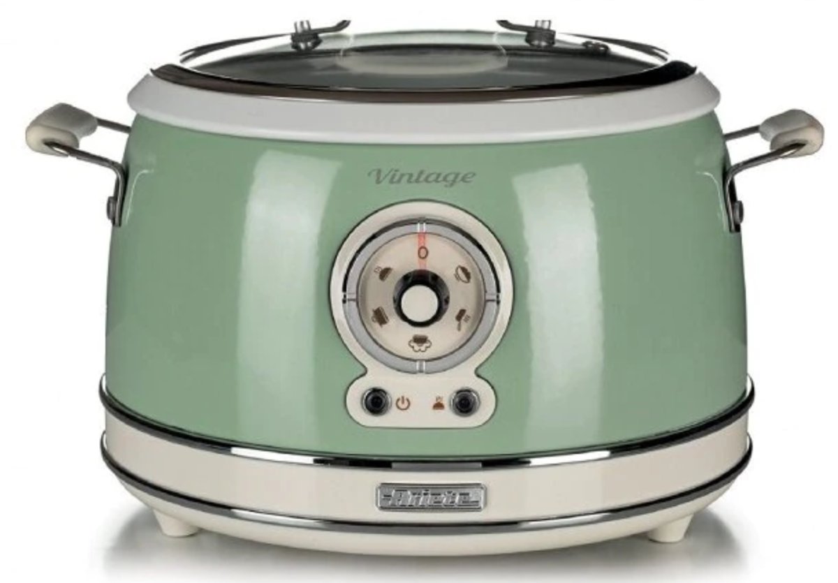 Możliwość przygotowania wielu potraw w jednym urządzeniu staje się faktem! Przedstawiamy kolejne urządzenie z wyjątkowej linii Vintage – wolnowar, garnek do ryżu, urządzenie do przygotowywania potraw sauté oraz parowar zamknięte w jednym produkcie! Wielofunkcyjny, zielony wolnowar Ariete 2904/04 Vintage otwiera przed Tobą moc kulinarnych możliwości! Zachwyć się wolnym gotowaniem w niższych temperaturach, smaż potrawy sauté, gotuj na parze. Nie masz czasu, na zjedzenie posiłku zaraz po przygotowaniu? Dzięki funkcji podtrzymania temperatury, Twoje dania pozostaną ciepłe przez wiele godzin, nie tracąc walorów smakowych. Pokochaj to urządzenie również za łatwość przechowywania! Nie musisz już kupować wielu naczyń do przygotowywania posiłków – wystarczy jedno. To rewolucyjne urządzenie jest tak piękne, że nie będziesz chciała chować go do szafki