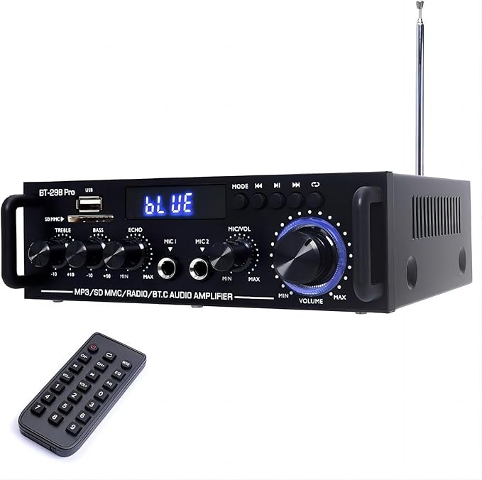 Odkryj wzmacniacz stereo Bluetooth Woopker BT-298 Pro – idealne połączenie nowoczesności z wysoką jakością dźwięku! Ten kompaktowy wzmacniacz o mocy znamionowej 45 W + 45 W i maksymalnej mocy wyjściowej 800 W to prawdziwy mistrz wśród urządzeń audio, który dostosuje się do Twoich potrzeb. Dzięki innowacyjnym technologiom i zaawansowanym funkcjom, wzbogaci każde spotkanie, imprezę czy chwile relaksu w domowym zaciszu.