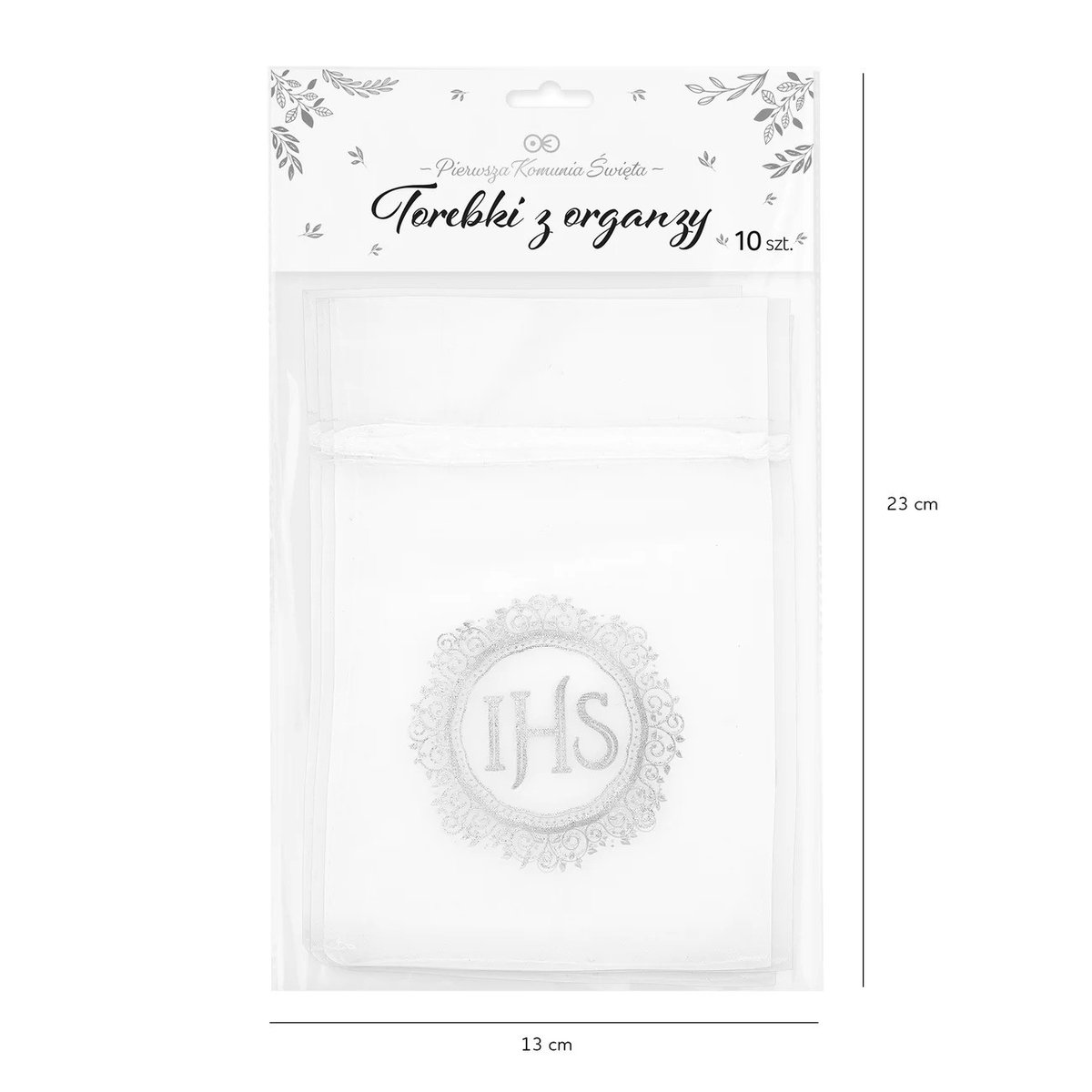 Woreczki wykonane są z delikatnej organzy, która nadaje im lekkości i elegancji. Biały kolor sprawia, że są uniwersalne i pasują do różnych motywów dekoracyjnych. Srebrny nadruk napisu IHS, symbolizującego Jezusa Chrystusa, wraz z delikatnymi gałązkami dodaje im duchowego charakteru i wyrafinowanego wyglądu.