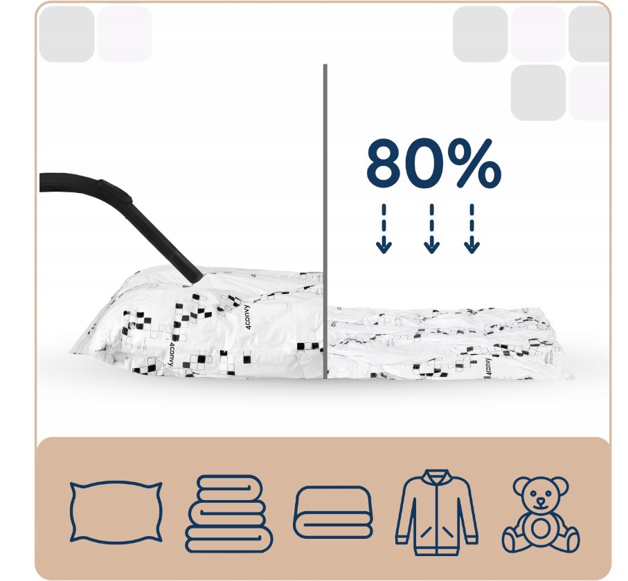 Nasze worki pozwalają na spakowanie rzeczy, które zajmują przestrzeń i są rzadko używane, takie jak dodatkowe kołdry, zimowe swetry czy koce. Wystarczy, że zamkniesz worek i odciągniesz powietrze odkurzaczem, a zyskasz więcej miejsca na inne rzeczy.