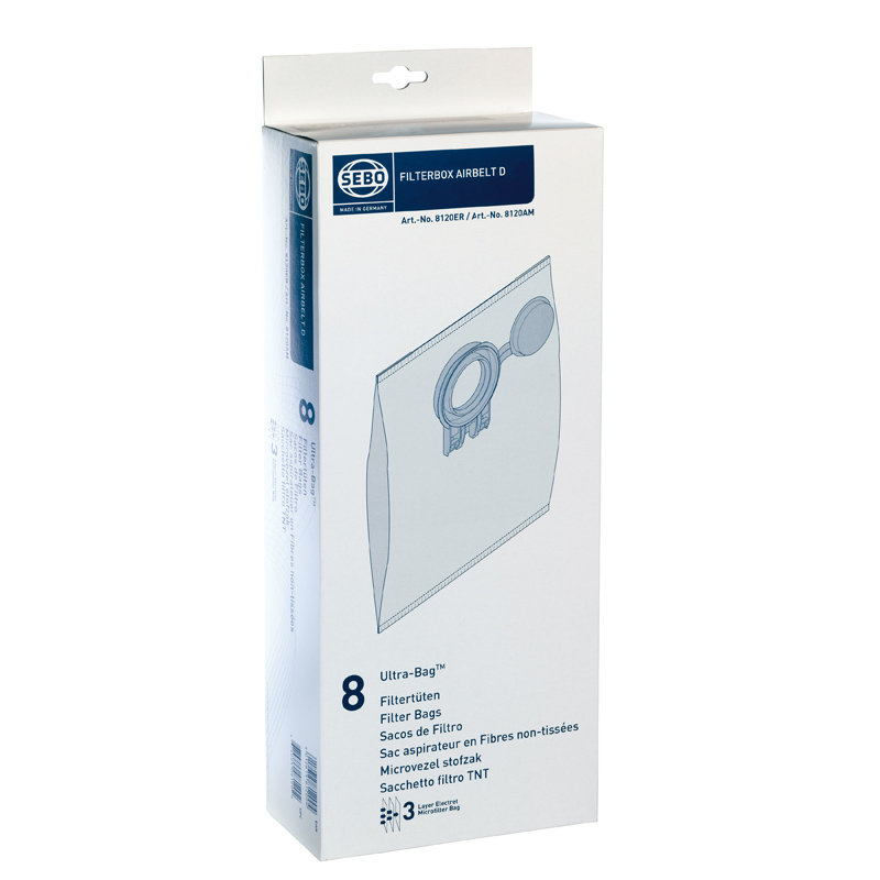 Komplet zawiera 8 sztuk, 3-warstwowych worków filtrujących z kapslami Ultra Bag o pojemności 6 l do odkurzaczy serii Sebo Airbelt D.