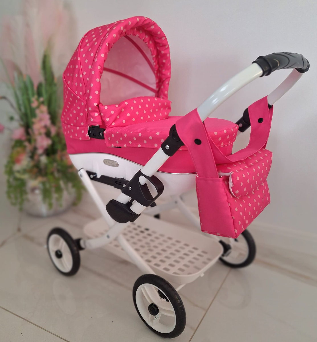 WÓZEK DLA LALEK LILY Z TOREBKĄ I PLASTIKOWYM KOSZYCZKIEM WZÓR LC-09 RÓŻOWY W BIAŁE KROPKIProdukt 100 % POLSKI - Gwarancja oraz system pogwarancyjnyWózeczek wyróżnia się ze względu na swój oryginalny